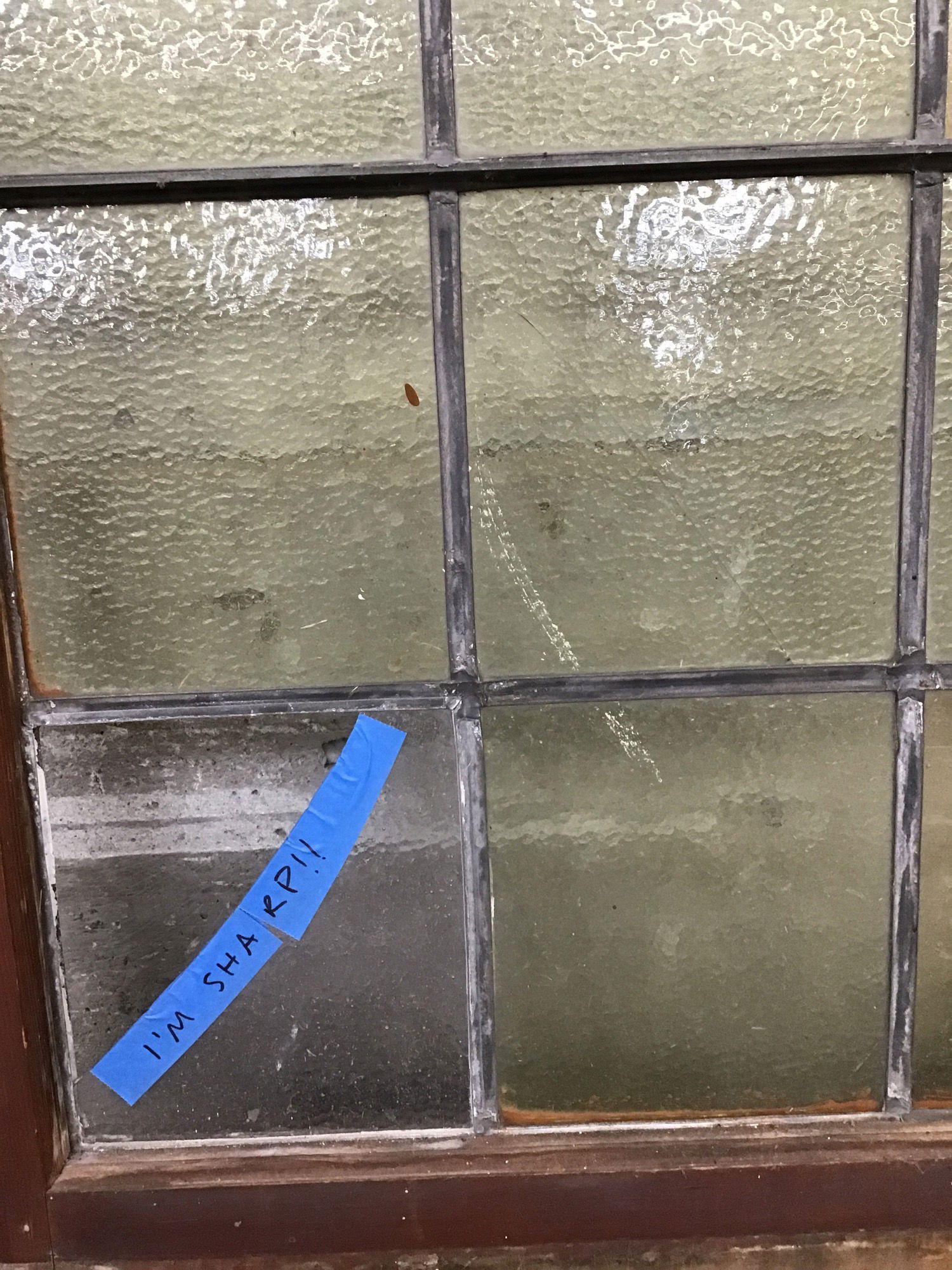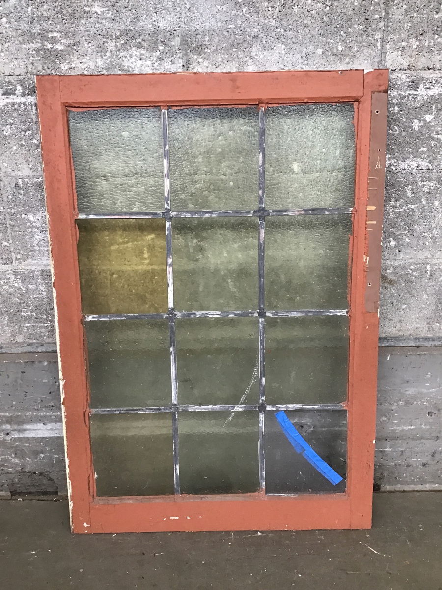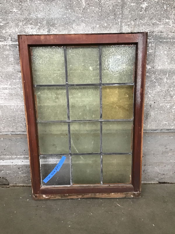 This window was delicately salvaged from a church-turned-mosque and brought here for you to enjoy! Features 12 true lead-divided panes, all are a beautifully textured yellow glass, and one that's just a little darker than the rest. Two panes are damaged, price reflects condition. Framed with vintage fir.