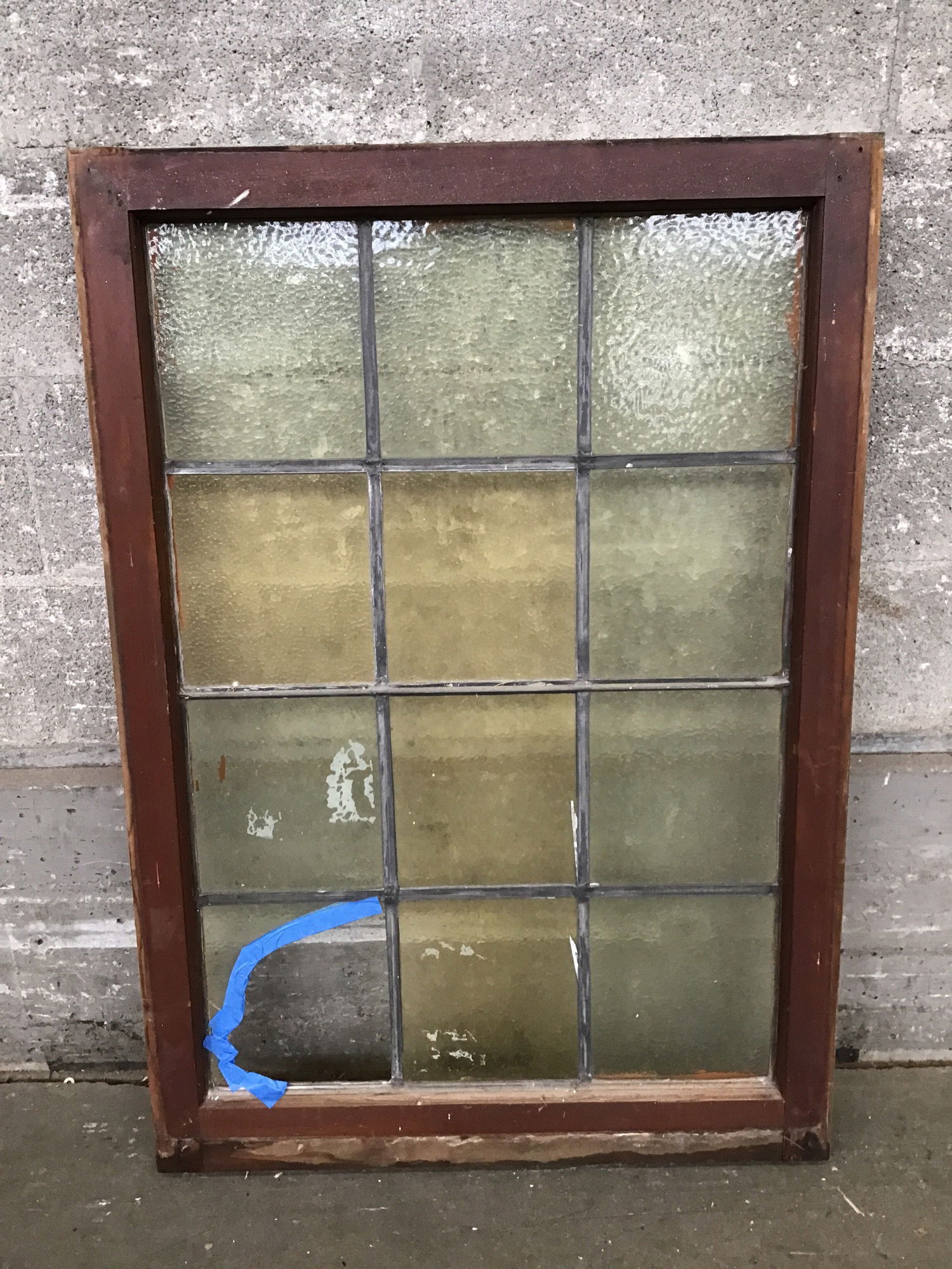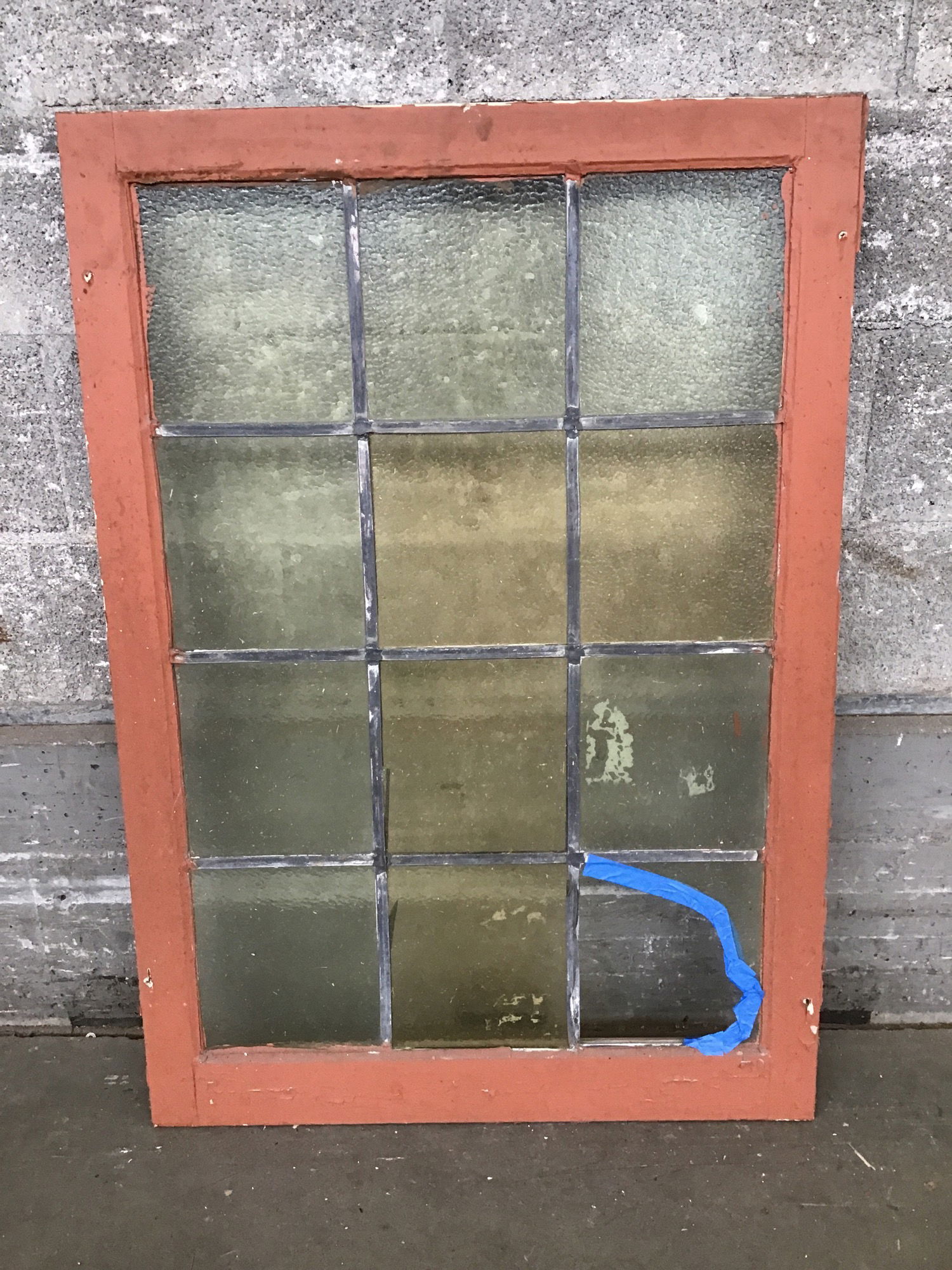 This window was delicately salvaged from a church-turned-mosque and brought here for you to enjoy! Features 12 true lead-divided panes, all a subtle yellow with a variety of textures. One pane is damaged on the bottom, price reflects condition. Framed with vintage fir.