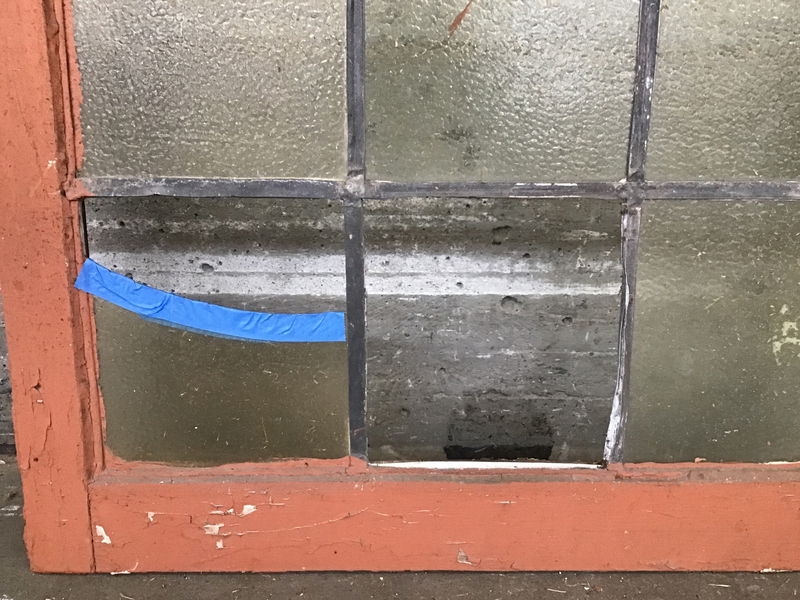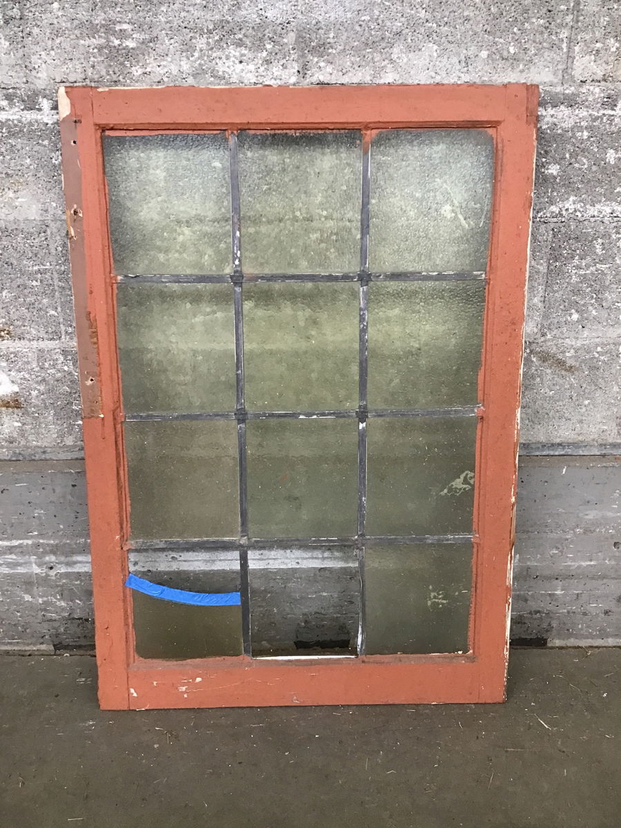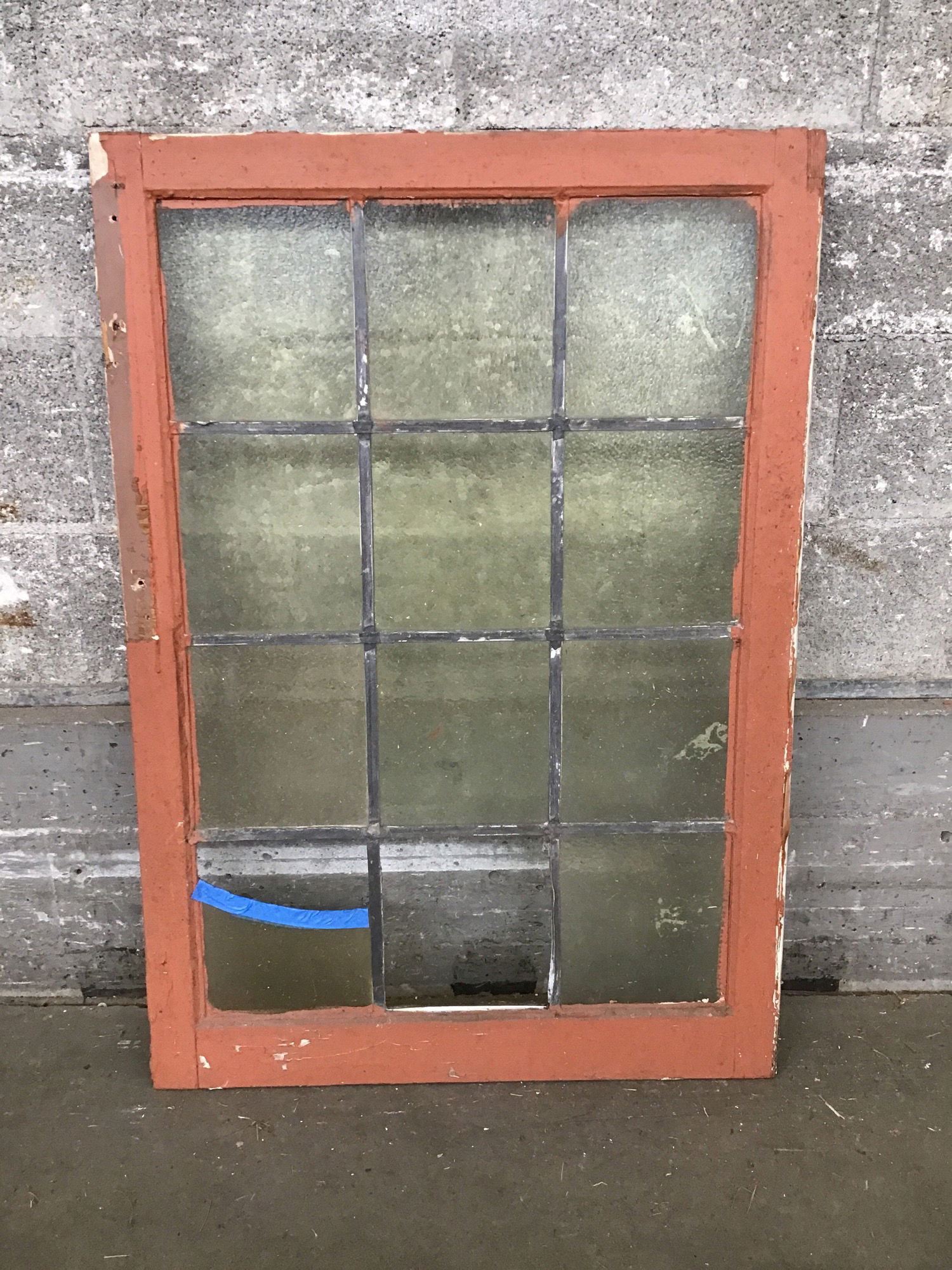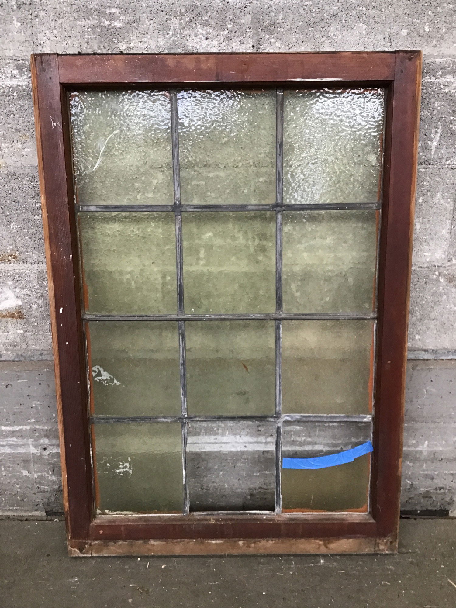 This window was delicately salvaged from a church-turned-mosque and brought here for you to enjoy! Features 12 true lead-divided panes, glass is a lovely subtle yellow with a variety of textures. One pane is broken and another is missing, price reflects condition. Framed with vintage fir.