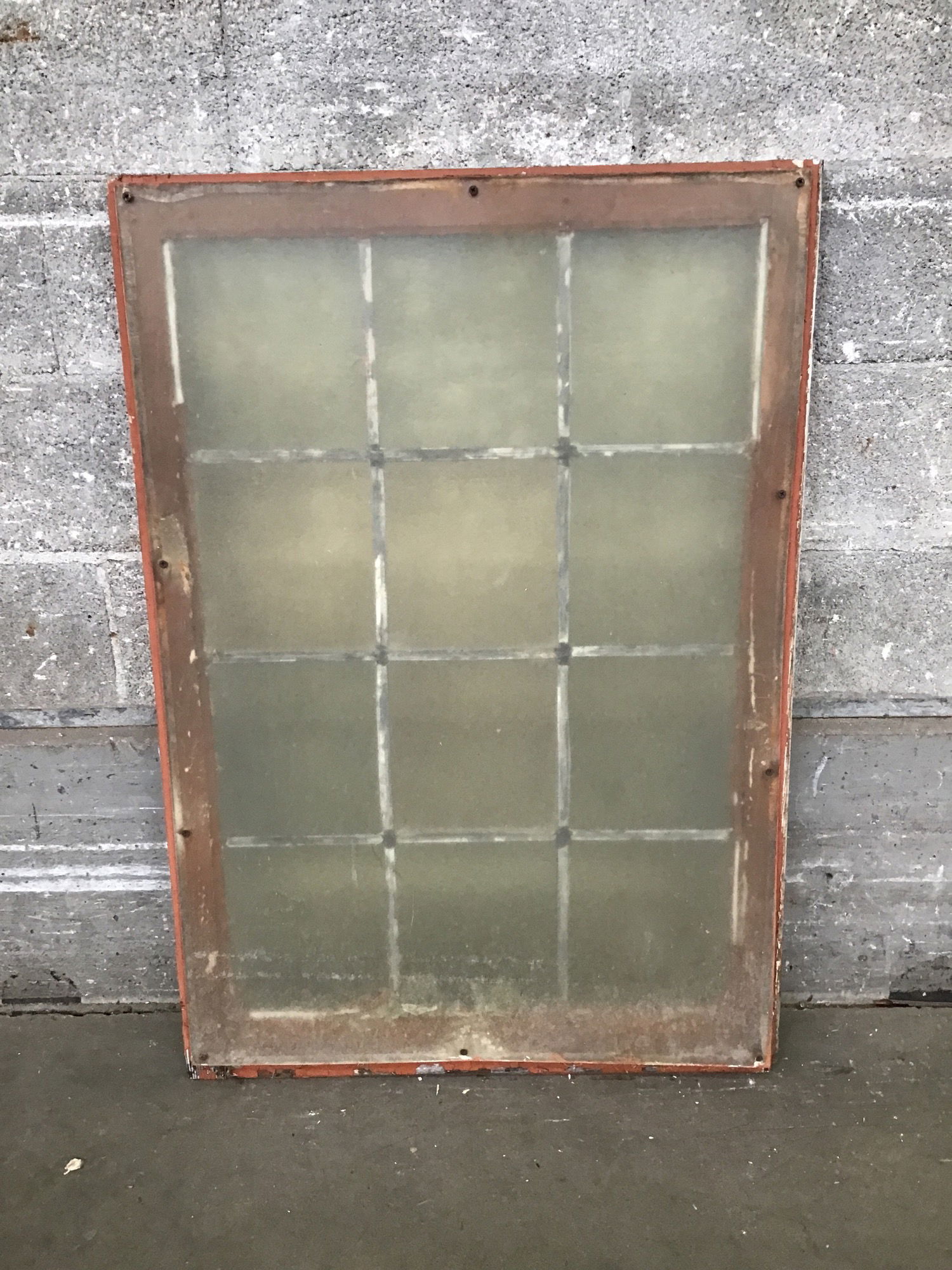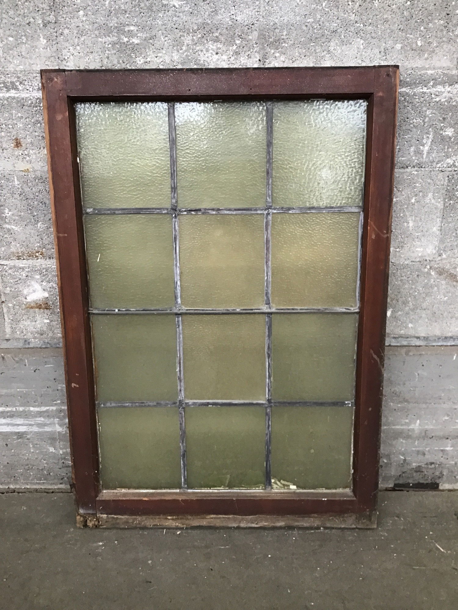 This window was delicately salvaged from a church-turned-mosque and brought here for you to enjoy! Features 12 true lead-divided panes, glass is a subtle yellow with a pleasant wavy texture. Came to us with a sheet of plexiglass mounted to one side, but should be easy to remove. Framed with vintage fir.