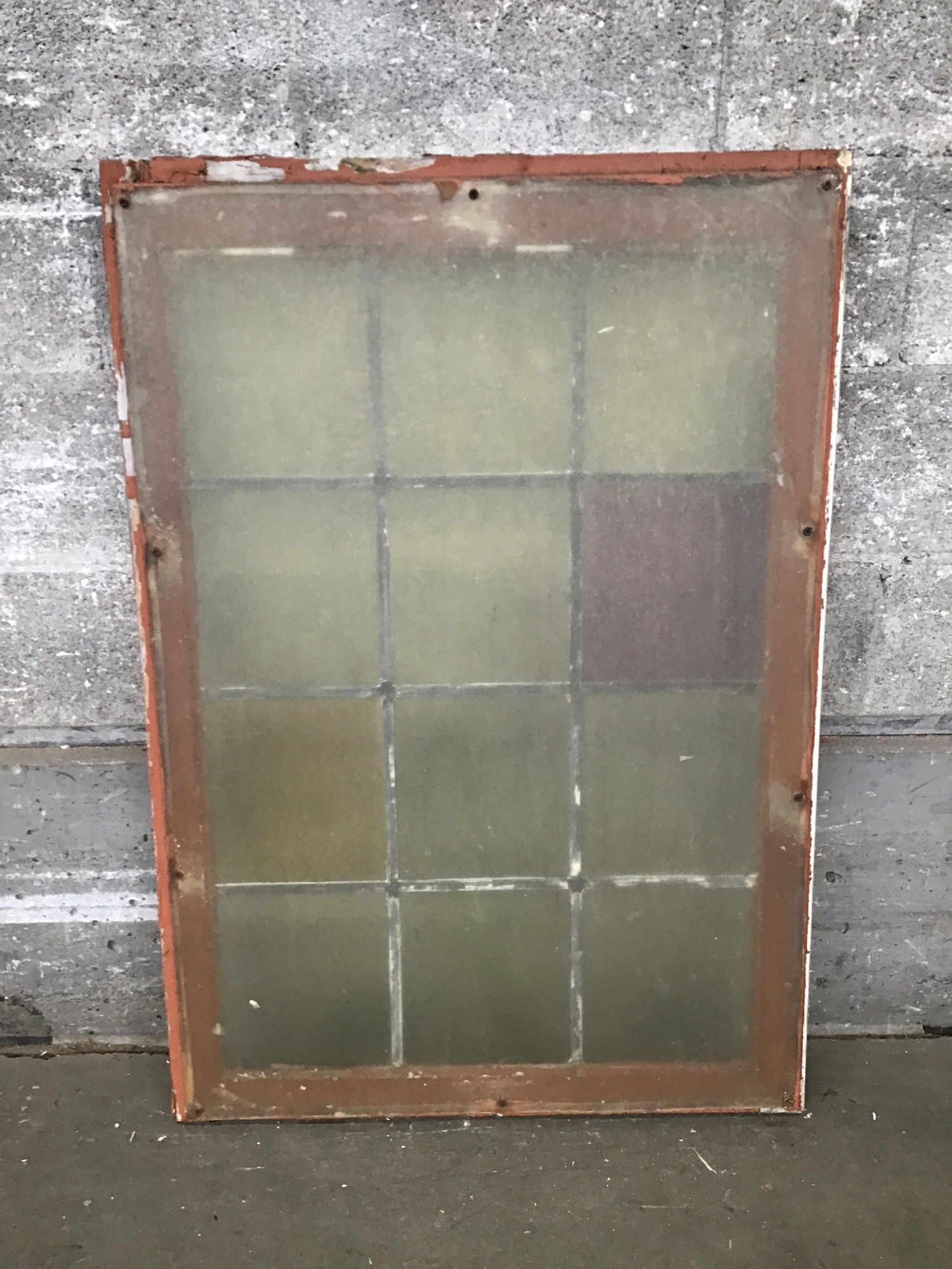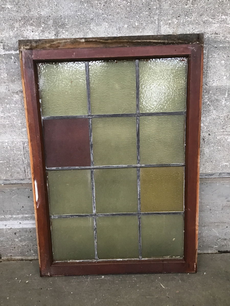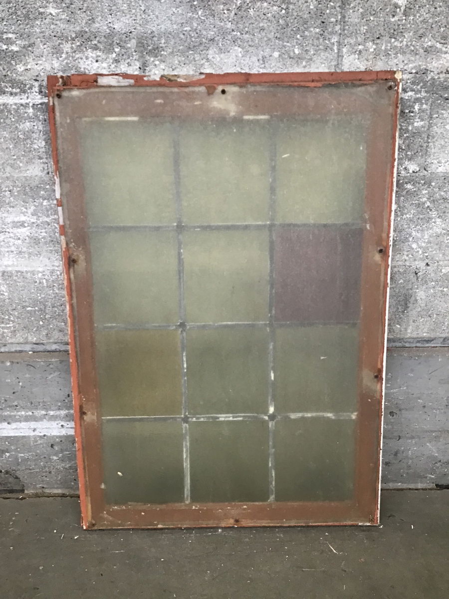 This window was delicately salvaged from a church-turned-mosque and brought here for you to enjoy! Features 12 true lead-divided panes, most are a subtle yellow with a pleasant wavy texture, save or one purple and one darker yellow pane. Came to us with a sheet of plexiglass mounted to one side, but should be easy to remove. Framed with vintage fir.
