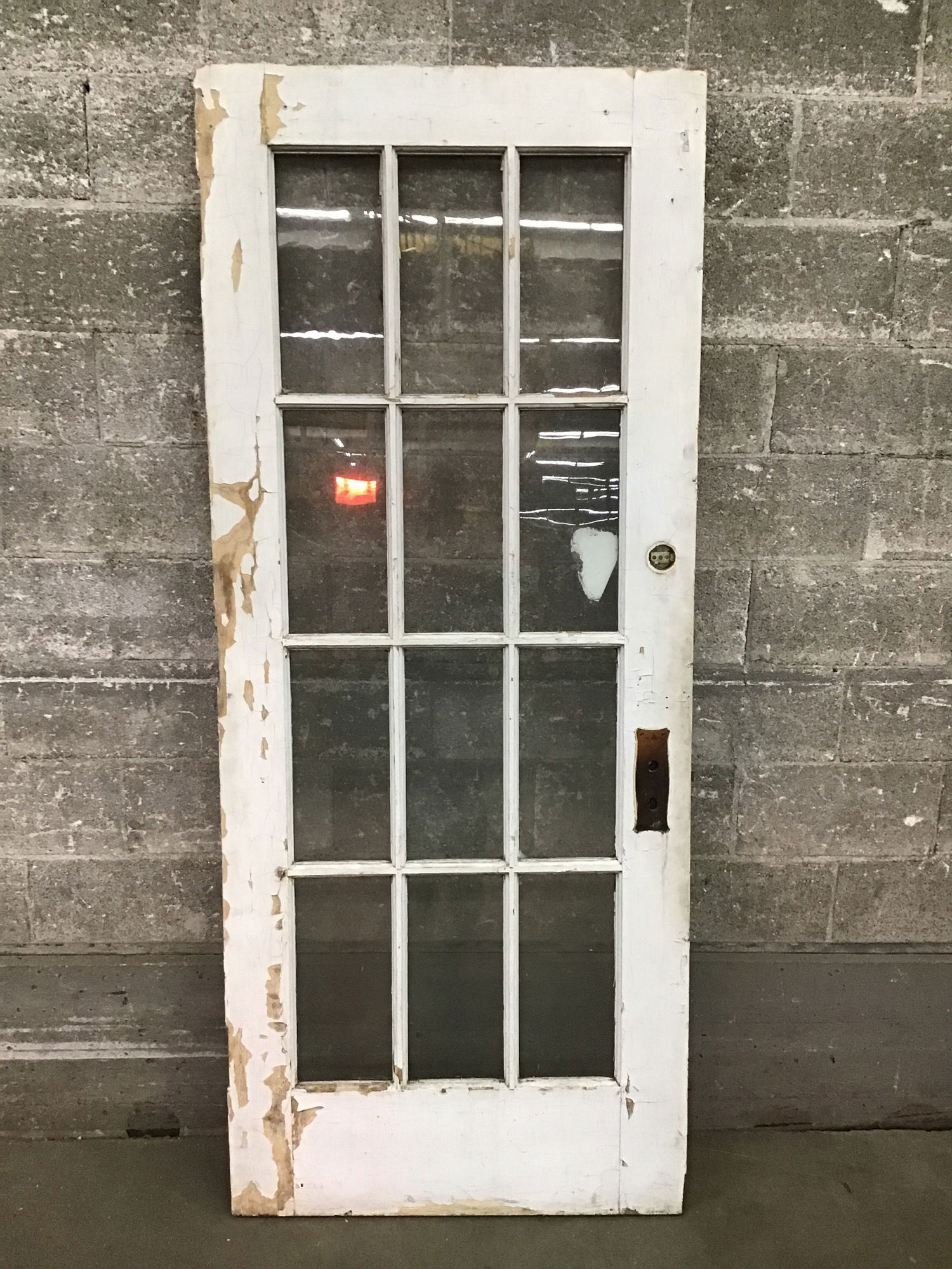 An exterior door with 12 true divided glass lites. The paint job on this one is a bit rough. There are a few chunks missing out of the trim around some of the glass lites; the price reflects.