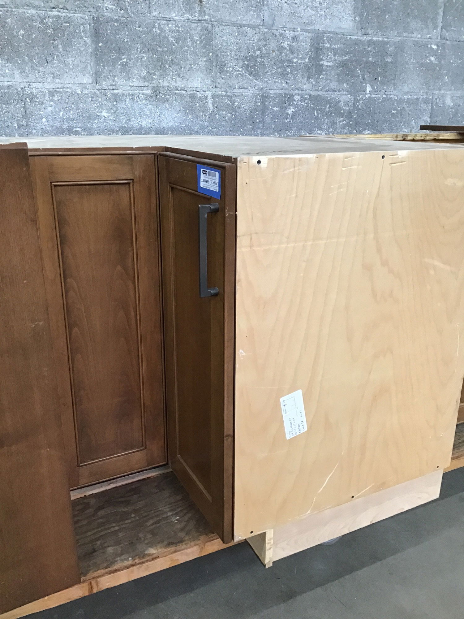 Voluminous custom stained corner kitchen cabinet with a really nice lazy susan inside.