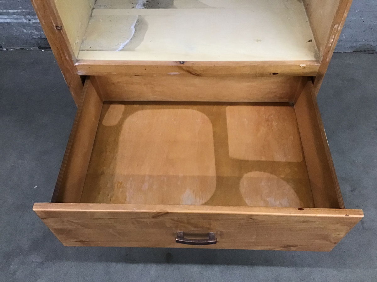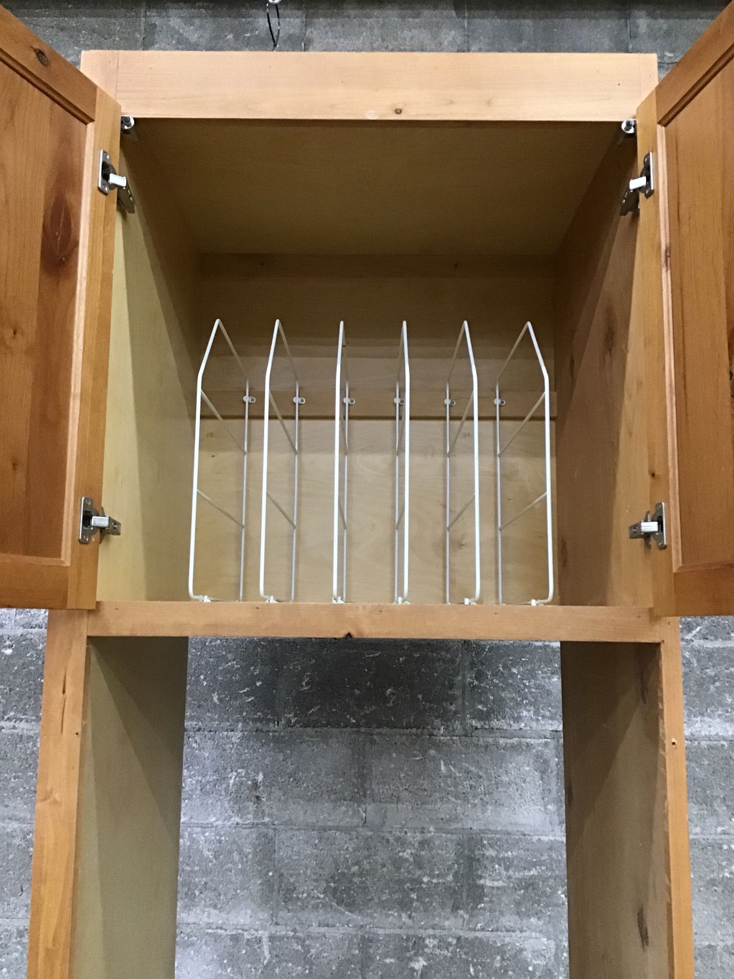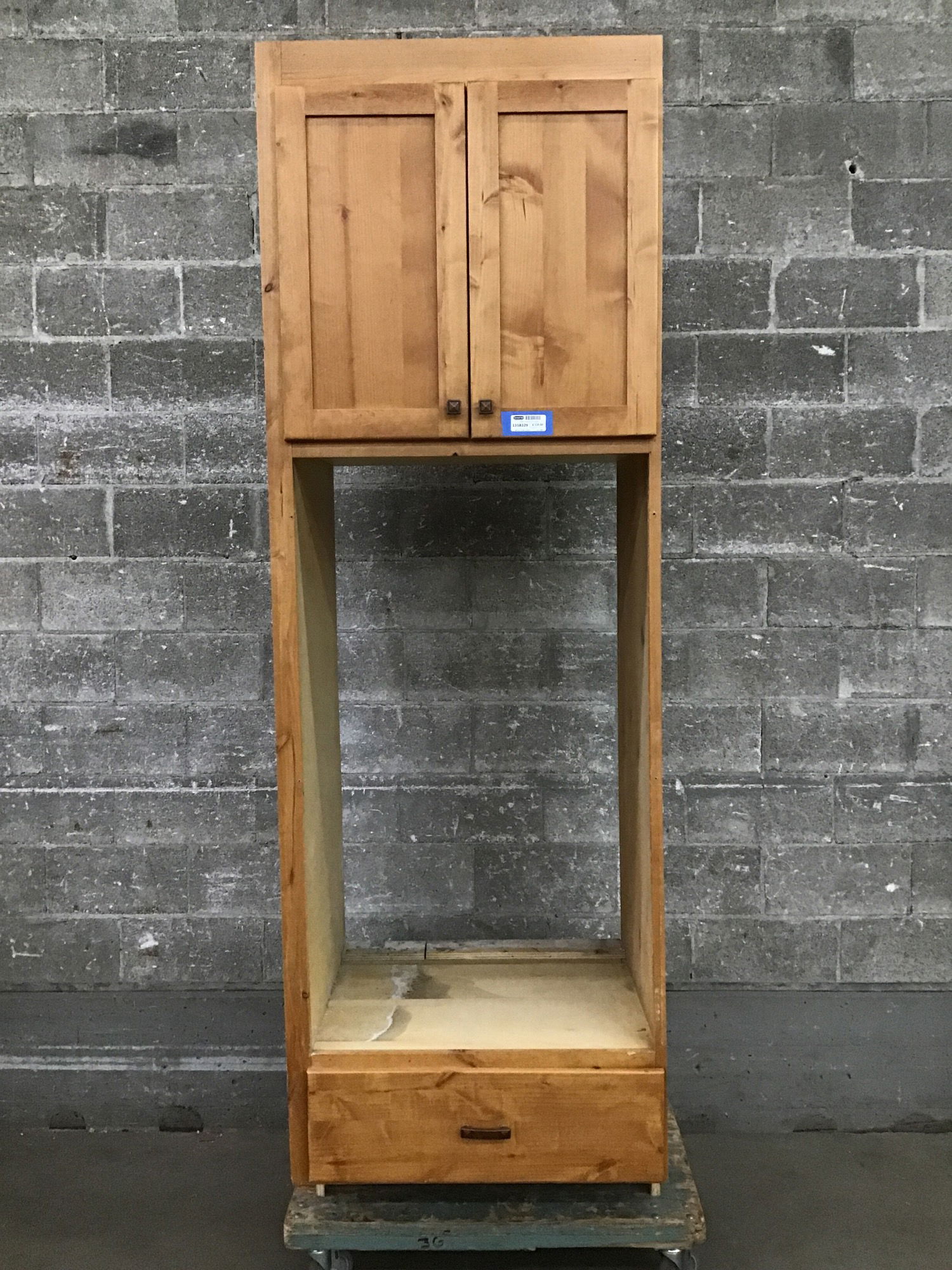 Supersized high quality custom cabinet with solid hardwood faces showing great color play in the spice-hued stain! This former wall oven unit has one undermount, soft close, full-extension drawer and a two door upper cabinet with built in rack for organizing cutting boards, baking sheets, etc. It sports fun geometric "antiqued copper" pulls. This would be a great addition to a mudroom or laundry room with a closet rod added in the cavity!