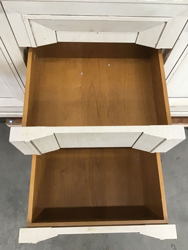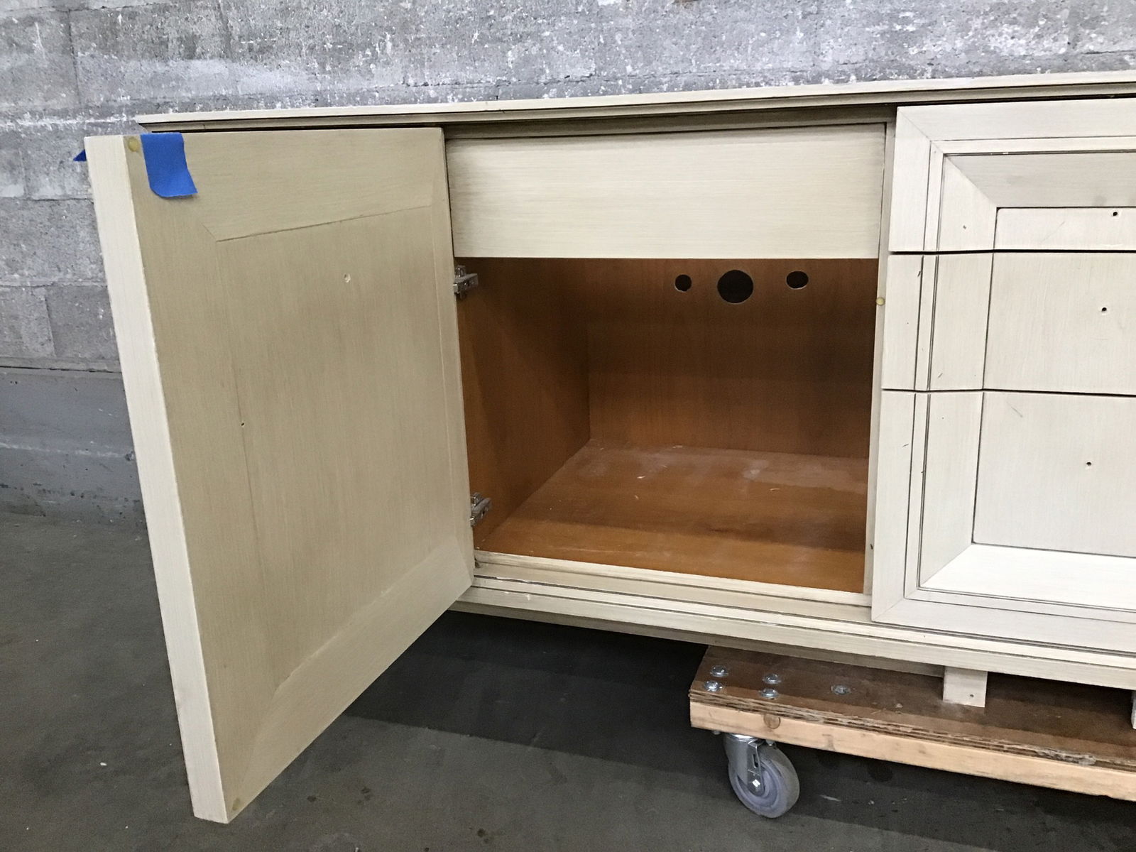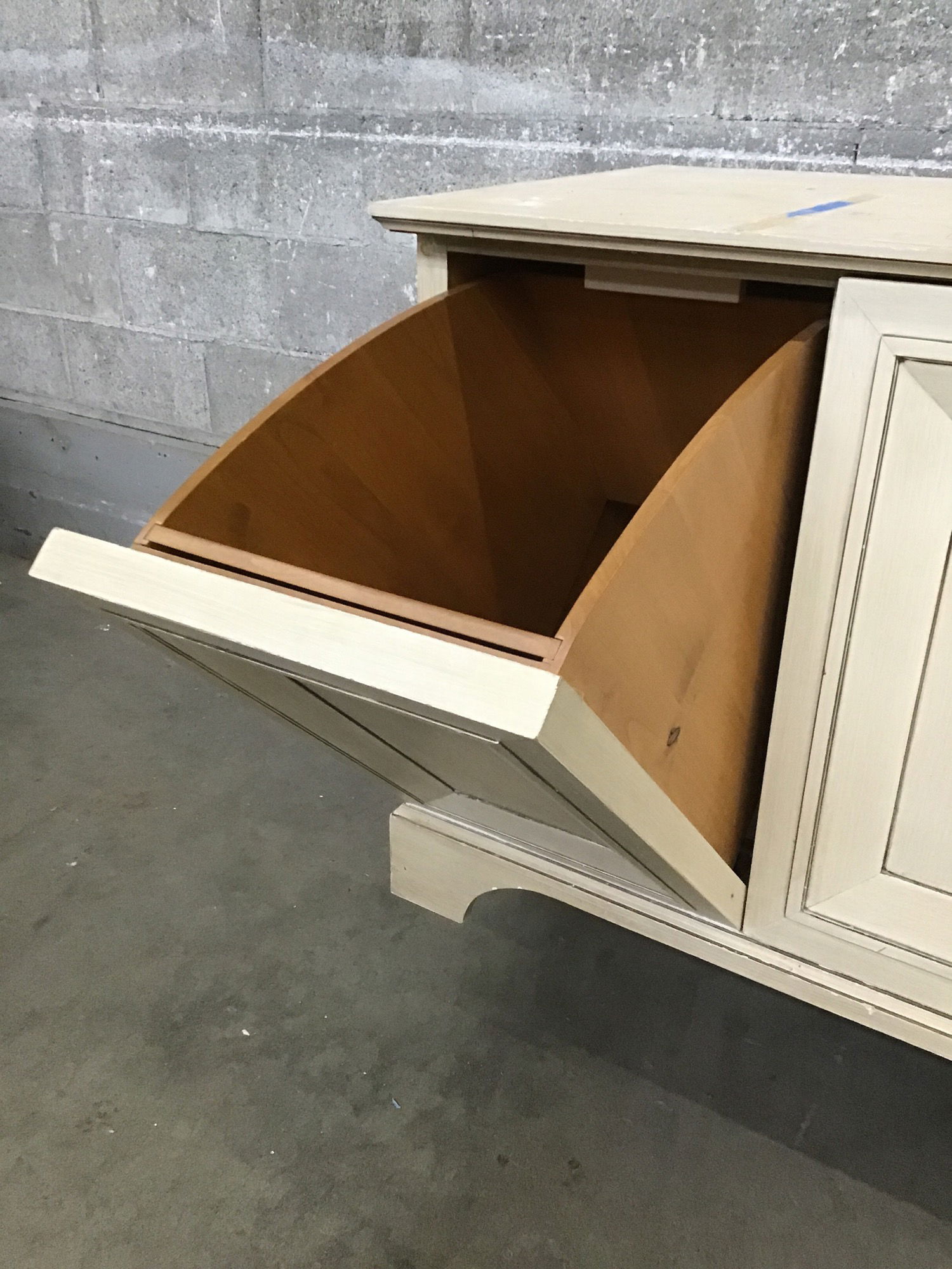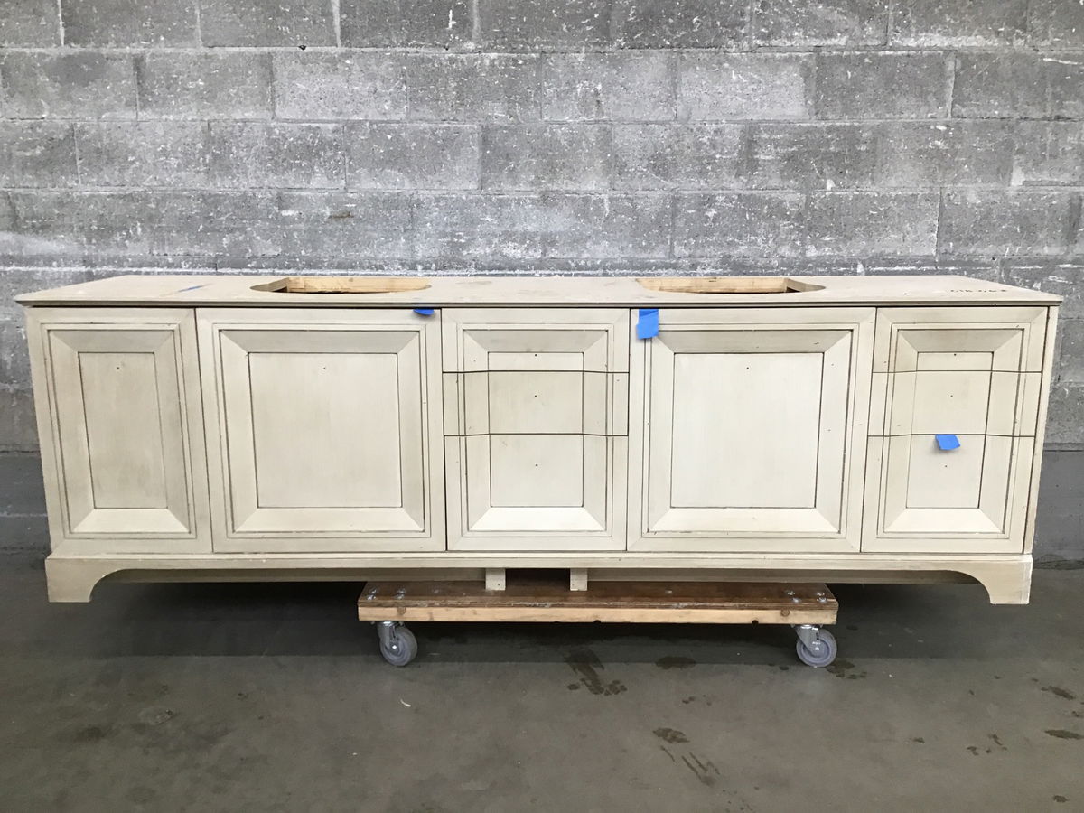 Custom painted and constructed double bath vanity base with multiple full-extension drawers and a laundry chute on the far left side that was designed to serve the previous house it was in. This unit has a freestanding look and one finished side, needs new knobs and a new countrop+sinks.