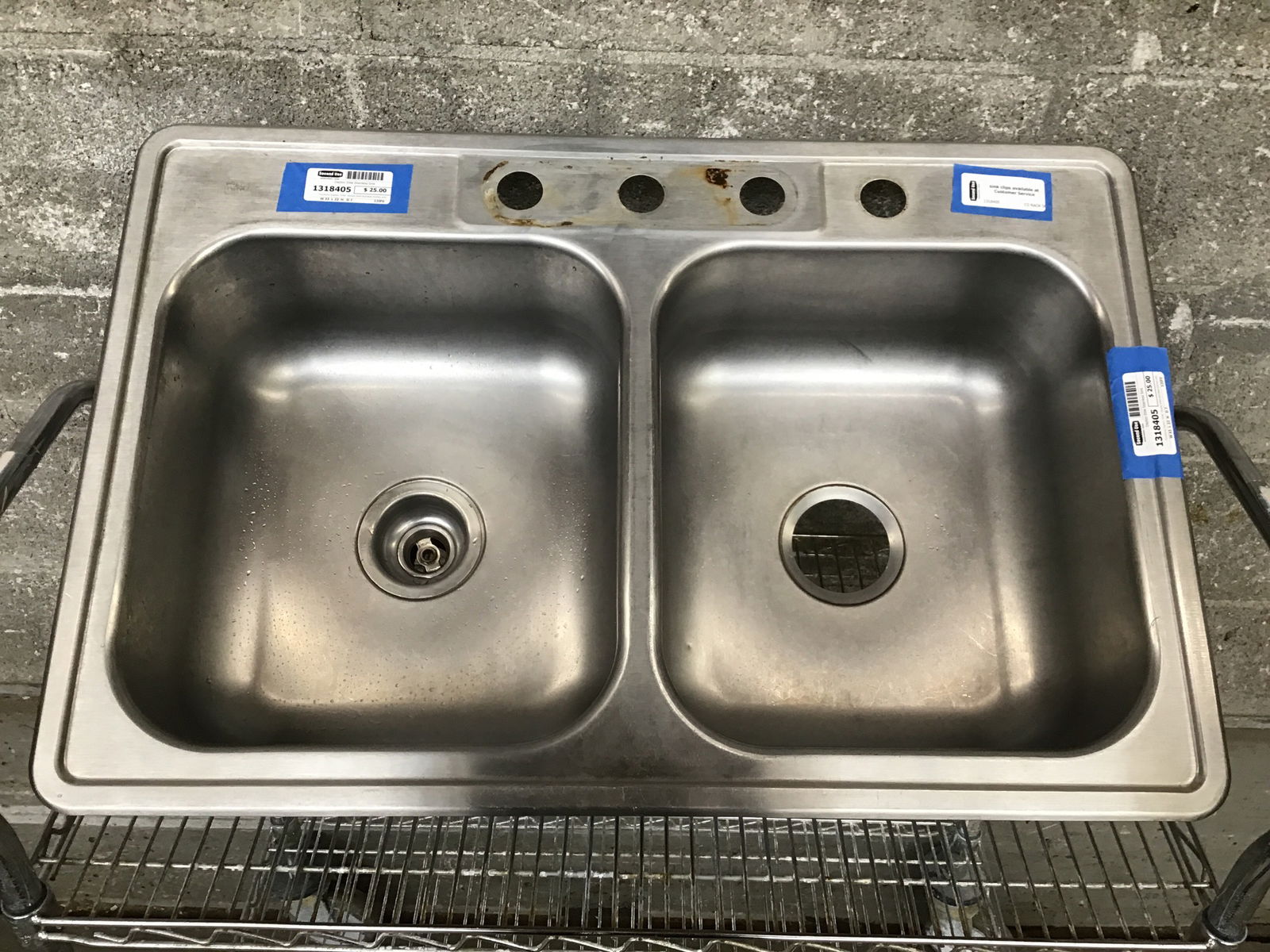 Functional Dayton "Elite" double bowl stainless kitchen sink. Has a 3 hole faucet mount and a bonus hole for either a detached hose or soap pump. Needs one drain fitting replaced.