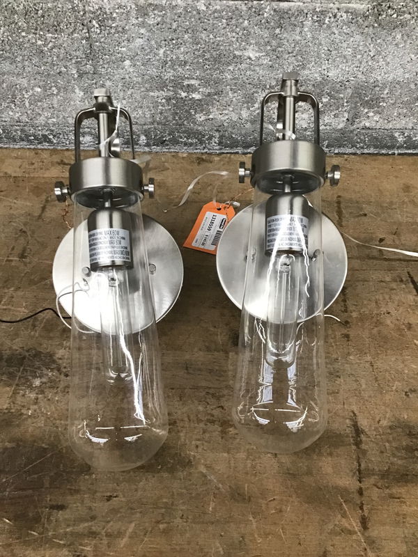 A pair of wall sconces with a large clear glass fitter and a stainless steel finish to its construction, which sports a streamlined industrial style. Manufactured by Nuvo Lighting, part of their Beaker line, suitable for damp locations. Retails new for about $165 each from the manufacturer.