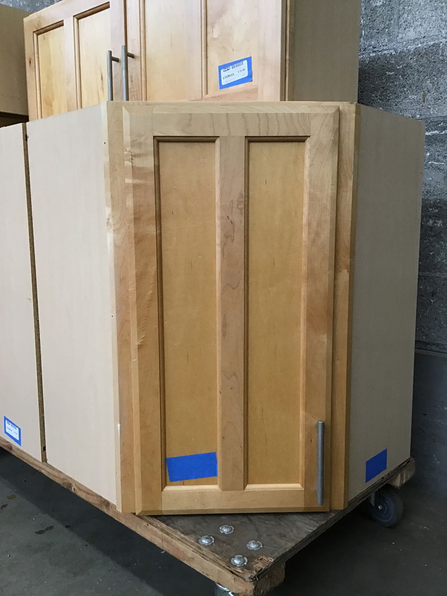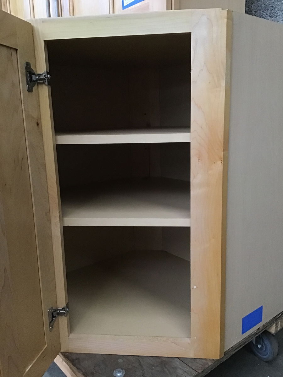 A maple-faced upper cabinet with a pair of adjustable-height shelves, a satin nickel pull, and a left-hand swing to the door.