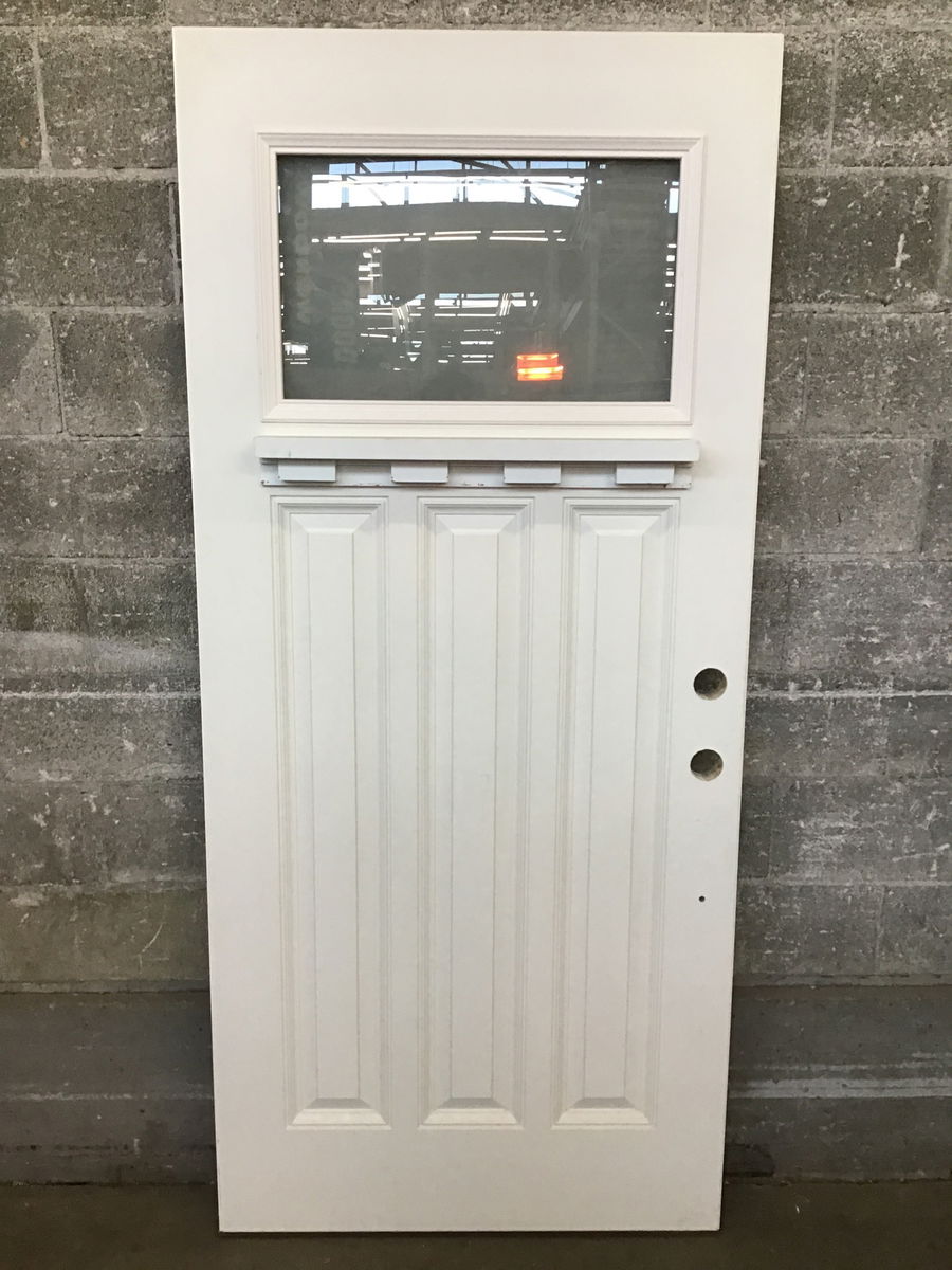 This is a like new, never installed fiberglass exterior door with a small obscured lite at the top and a dentil. There are 3 raised panels under the dentil.