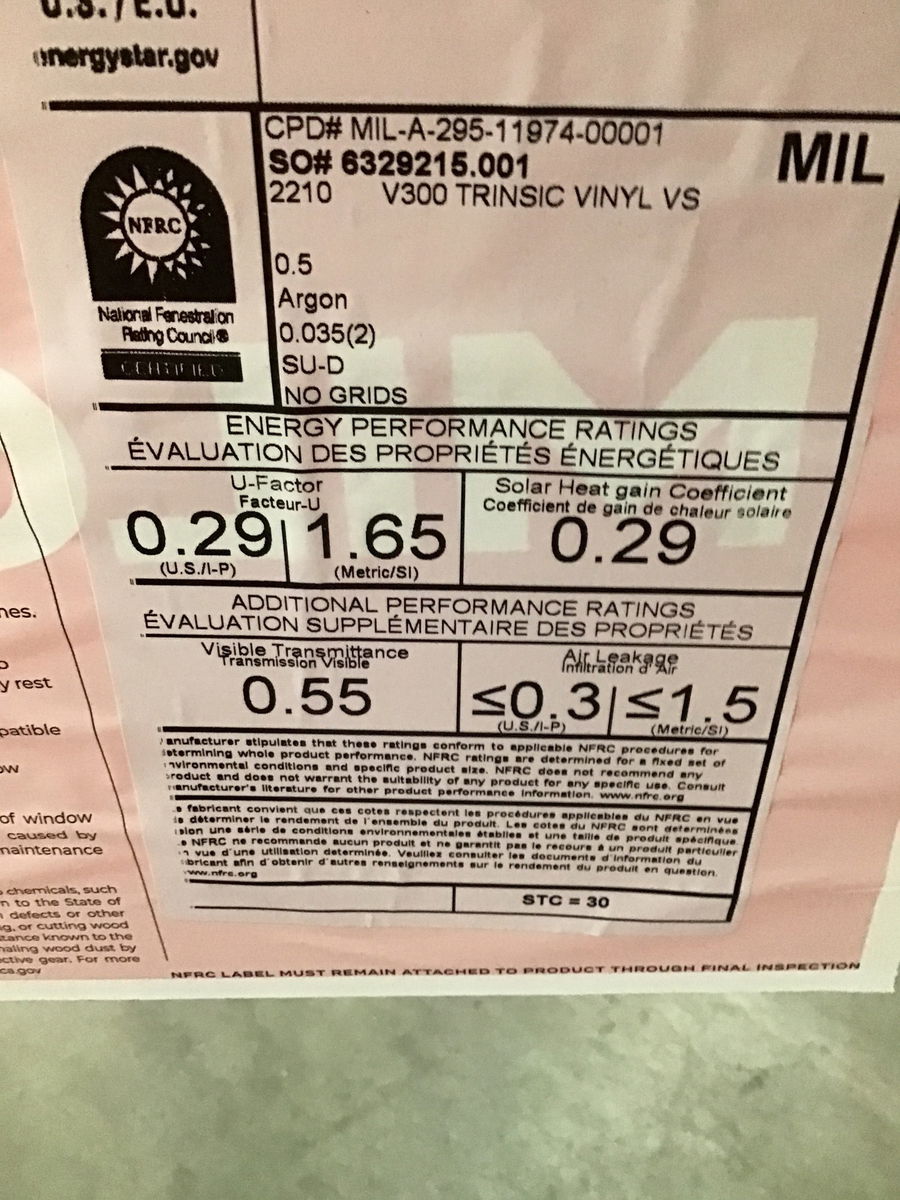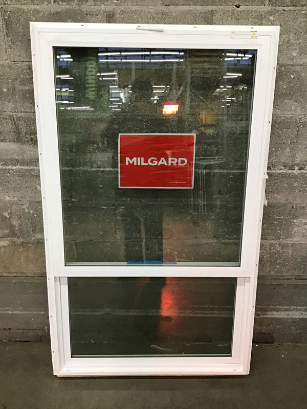 2025 white Milgard single hung vinyl window with energy tag. Like new condition and appears to have never been installed.