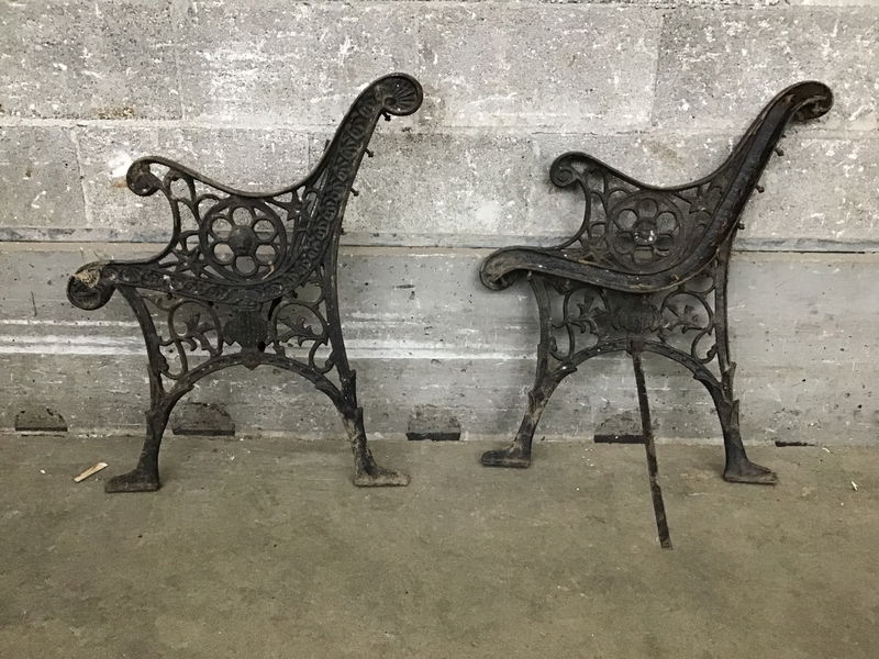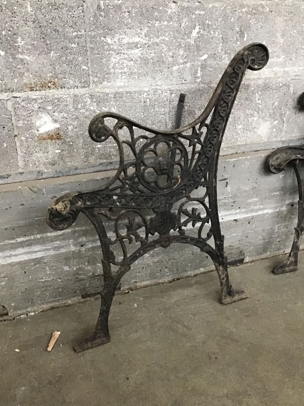 Cast iron garden bench project. Includes the two sides so you'l need is to make new slats and buy some hardware to attach them to the bases. The center bar is included but bent.