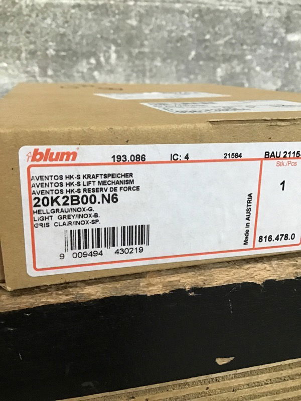 Pair of Blum 20K2B00TN6 "Aventos HK-S" Lift Mechanism hinges that are new in box, but didn't come with the back plates that mount to the cabinet door. Cheapest set I found online was $46. Item may have cosmetic damage. Photo may be representational.