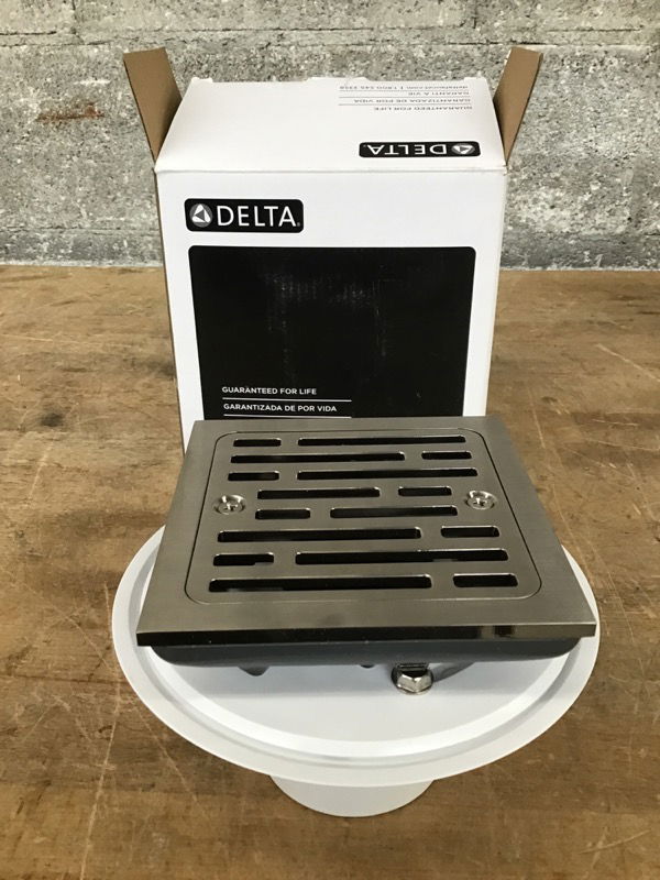 Here we have a like new Delta 4" Tile In square shower drain in a chrome finish. Product number DT062412. Regularly retails new at $98.65.