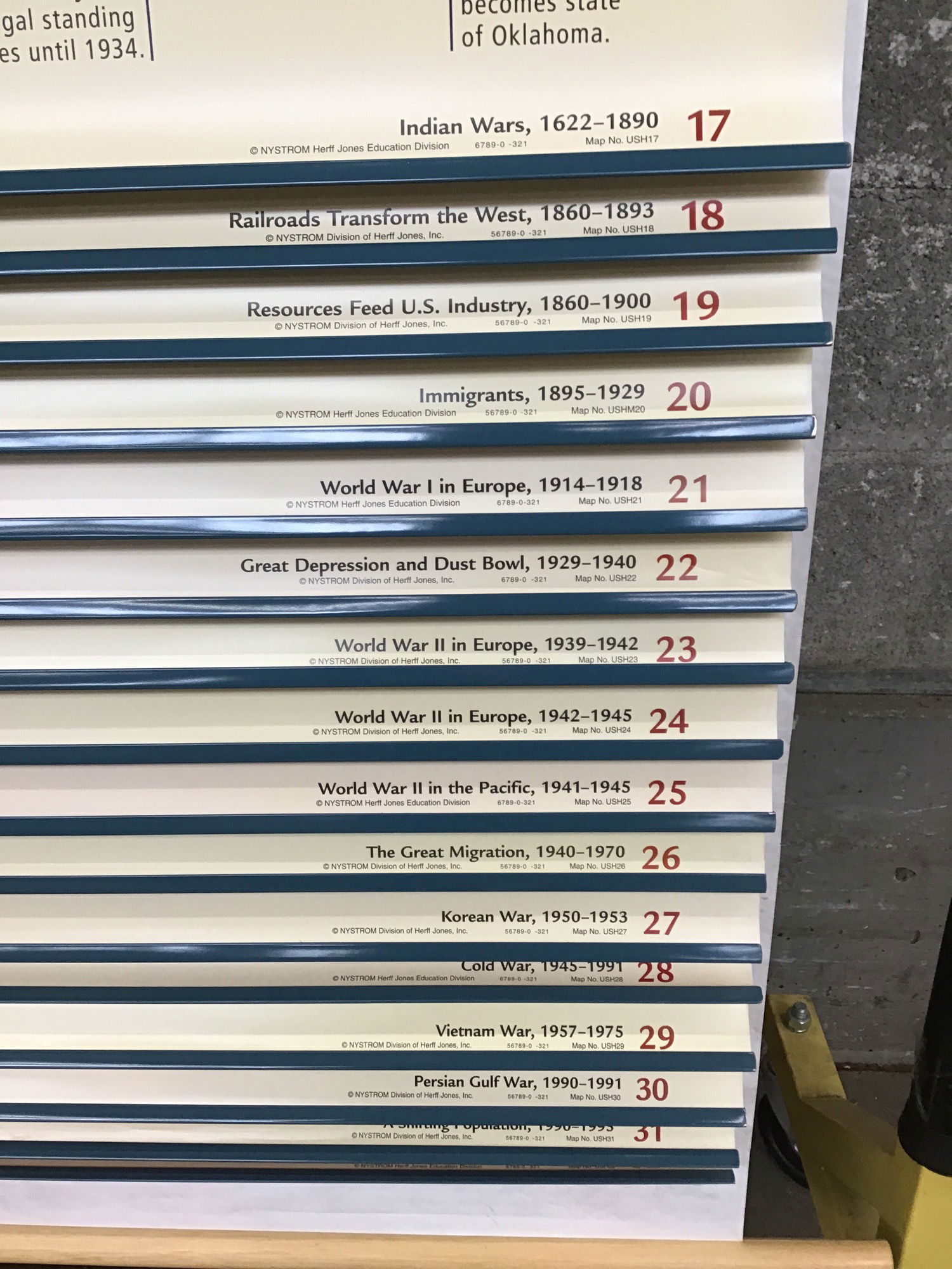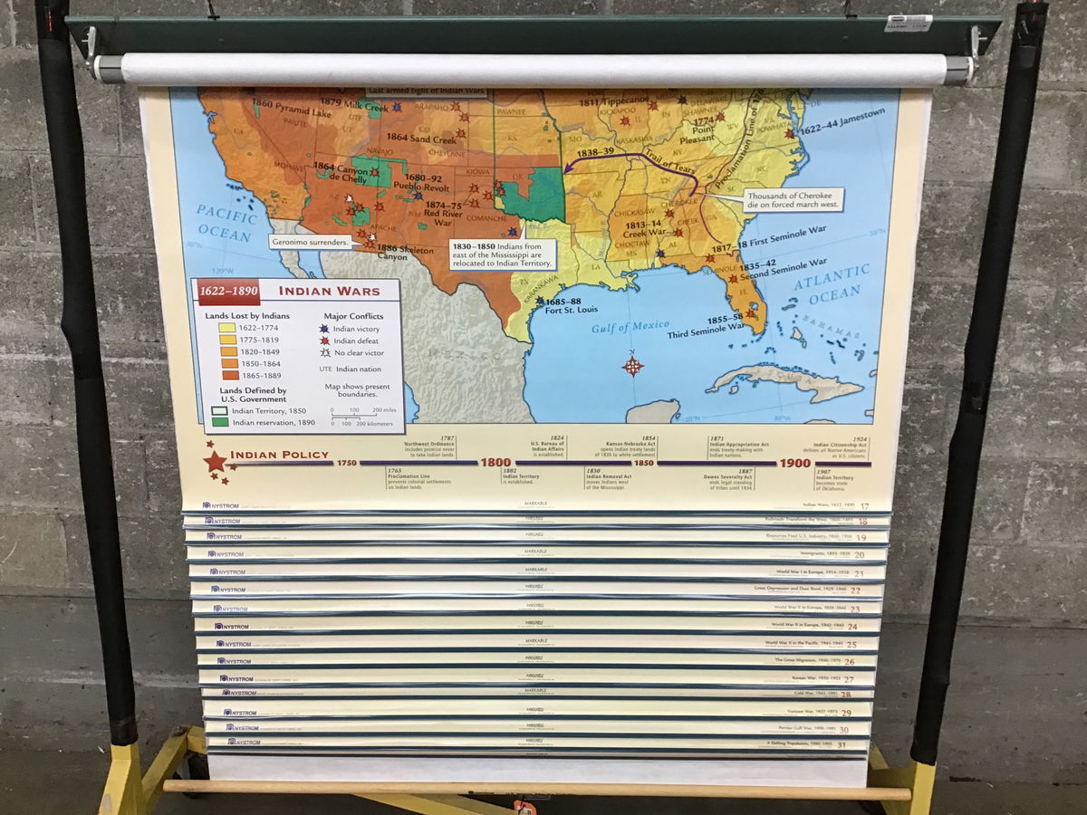 There are fifteen maps on one reel all dealing with post Civil War history and geography. The map is made by Nystom and has markable surface. Was probably made in the late 1990s. Pulls down and retracts as it should.
