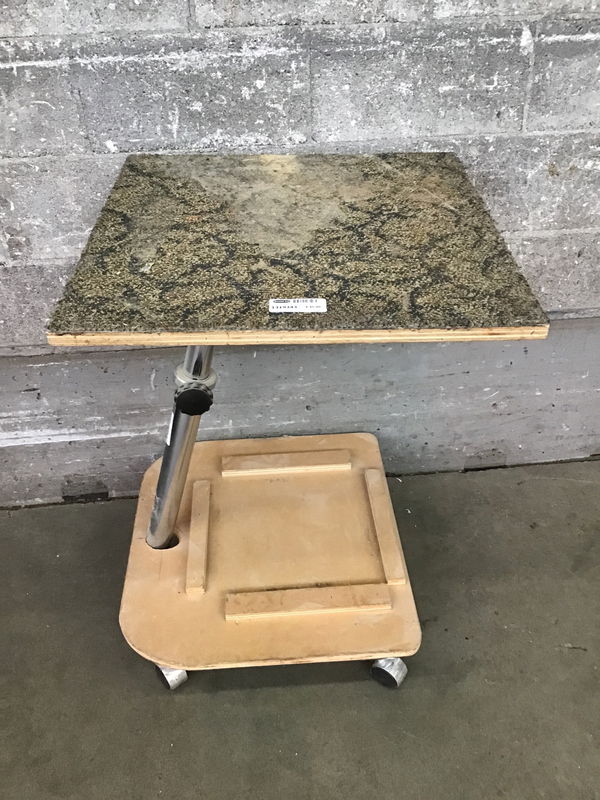 This is a rolling shop cart with a metal frame and an adjustable height. The surface is carpeted.
