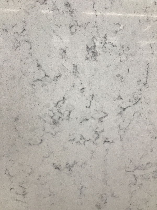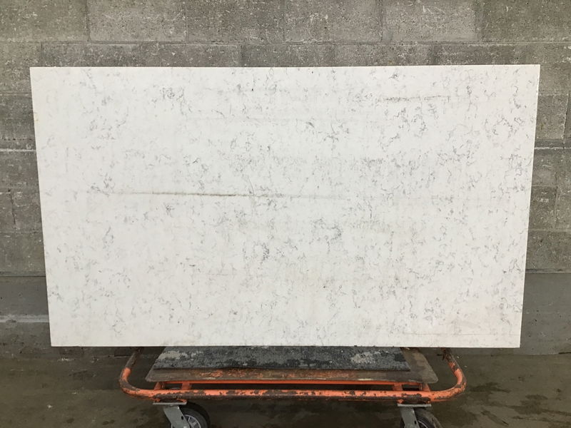 Marble-like composite stone slab countertop that is ready to be an island in your kitchen with its four finished edges. It has a few minor cosmetic things happening but they aren't terribly conspicuous.