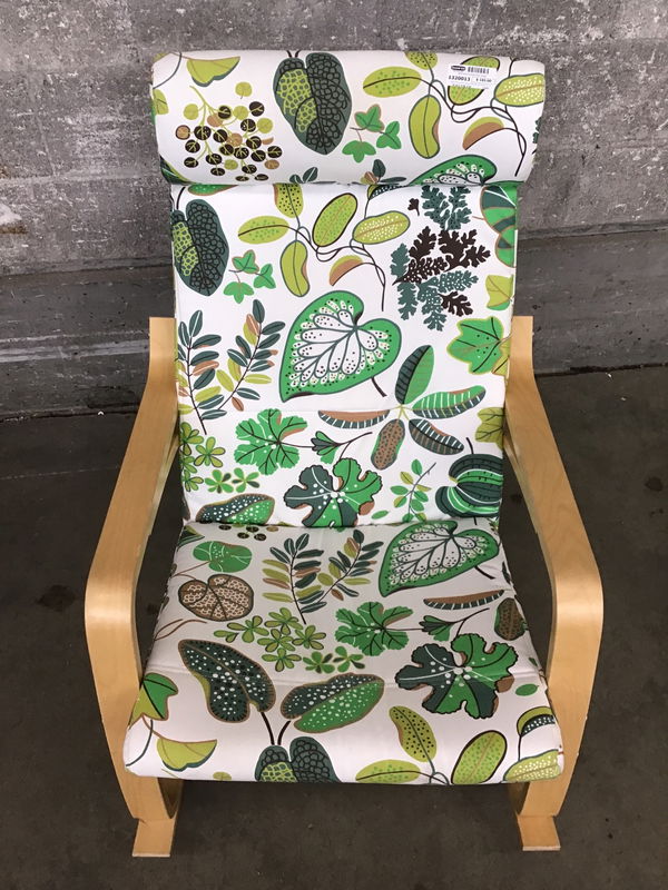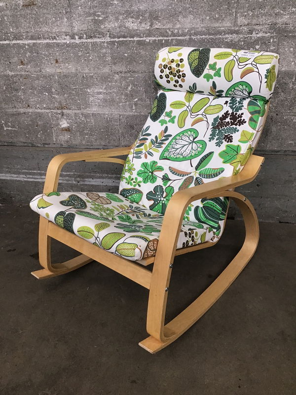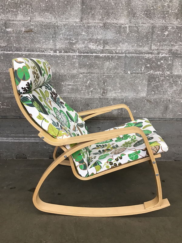 Great IKEA bent ply Poang lounge chair that rocks and is upholstered with a super yummy botanical print fabric.
