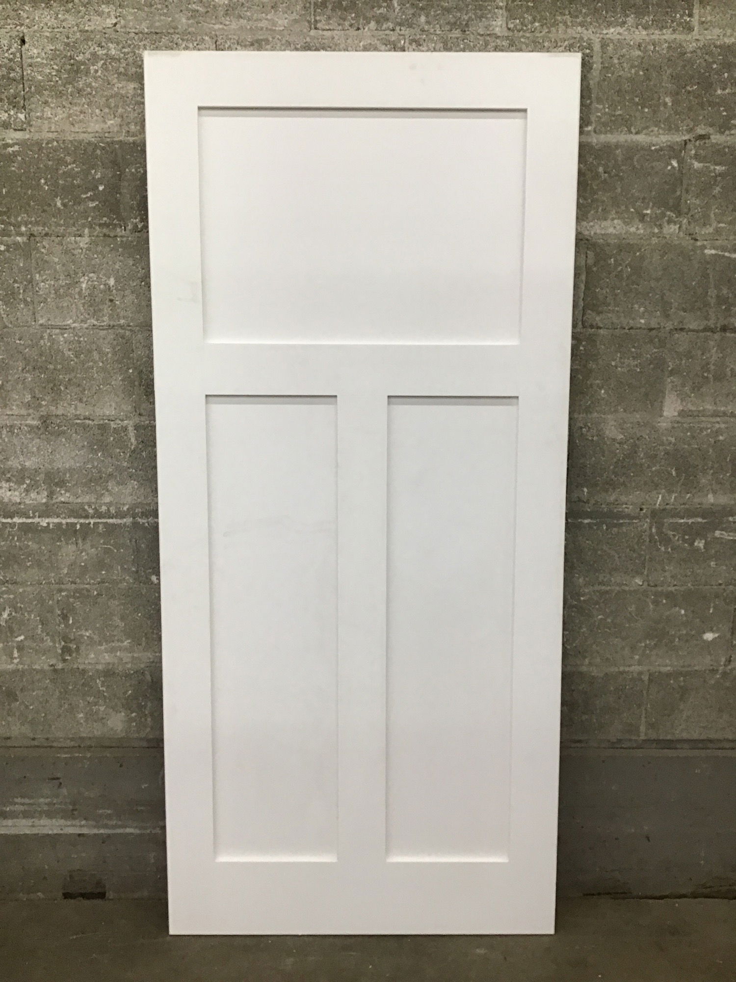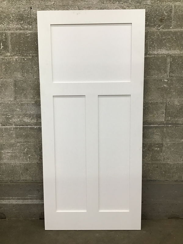 Undrilled primed masonite Craftsman style three panel interior door, ready for your paint of choice.