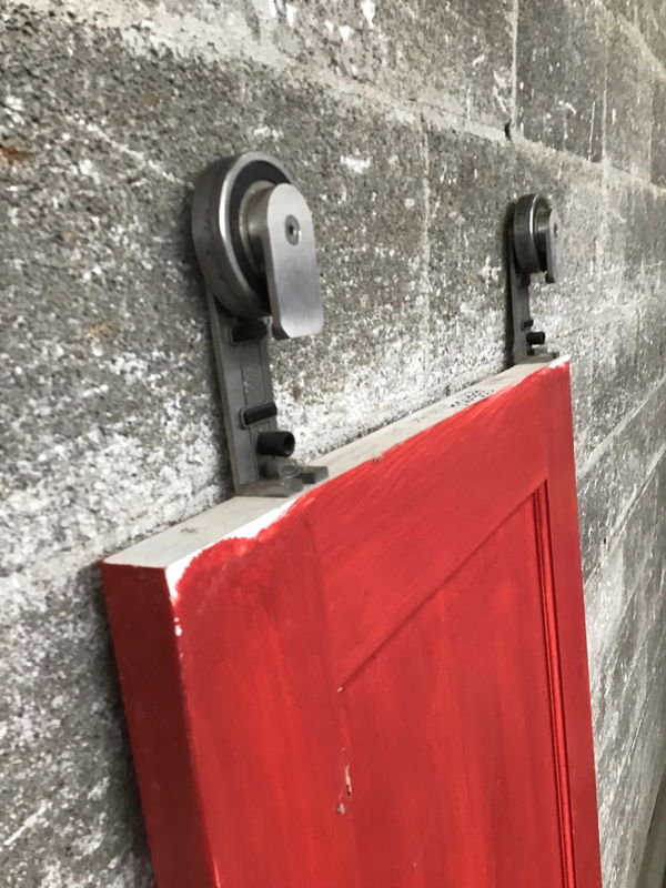 This is a one panel interior door that was used as a barn door. Comes with inset pull and rollers attached. Even painted red like a classic barn.