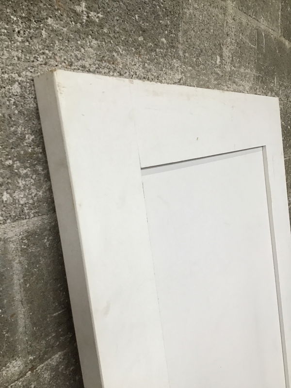 This is a shaker paneled exterior thickness (but primed masonite is NOT intended for weather exposure) door with no hinge cuts and no bore holes, leaving you to make the door how you want.