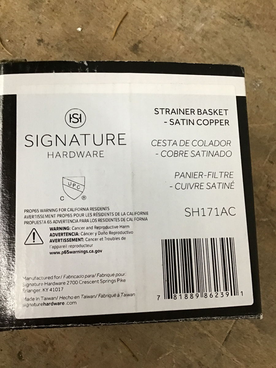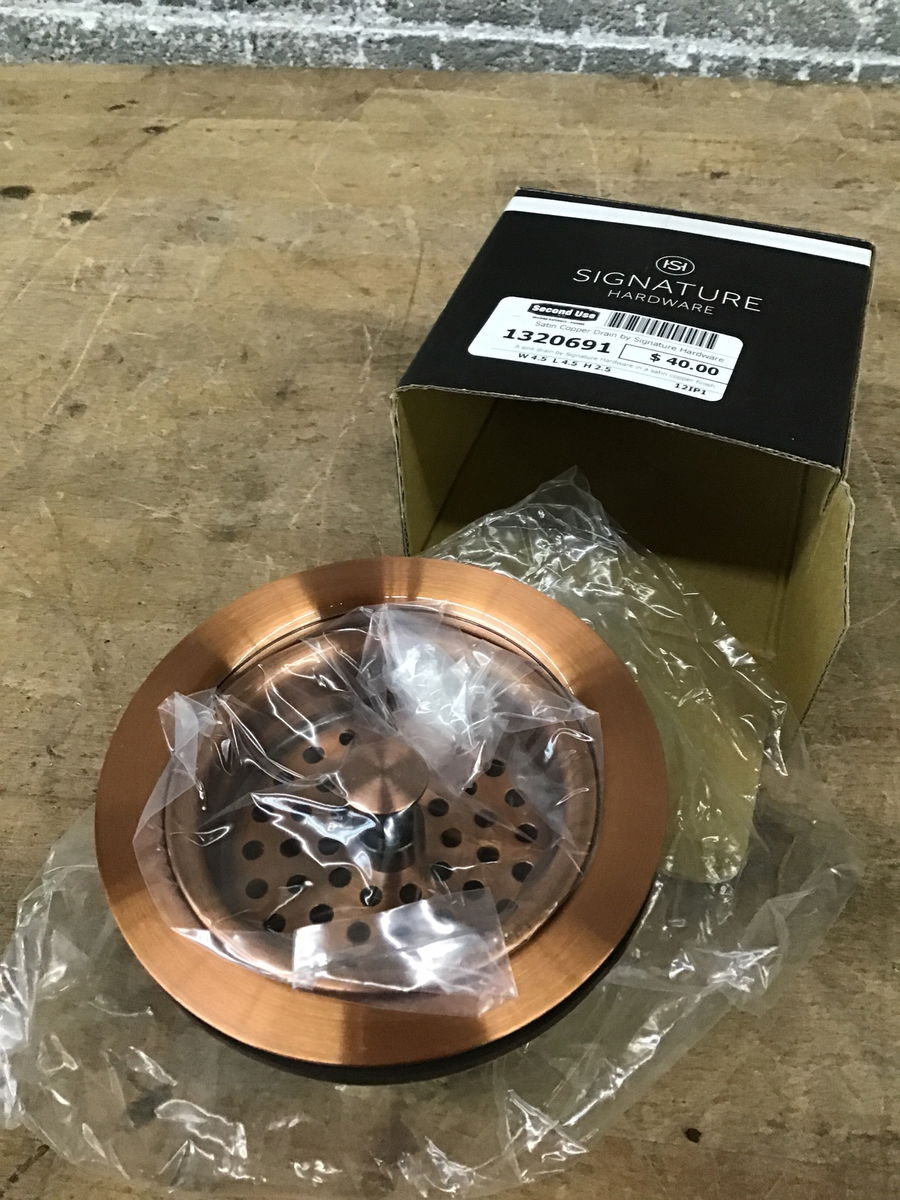 A sink drain by Signature Hardware in a satin copper finish. Looks like new and to have never been installed. This seems to retail new at $82.60.