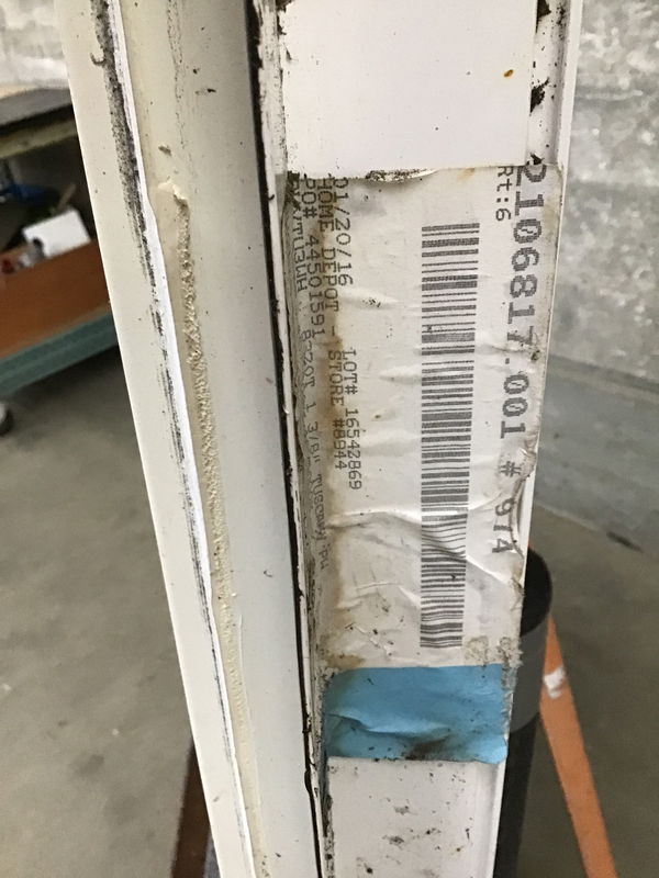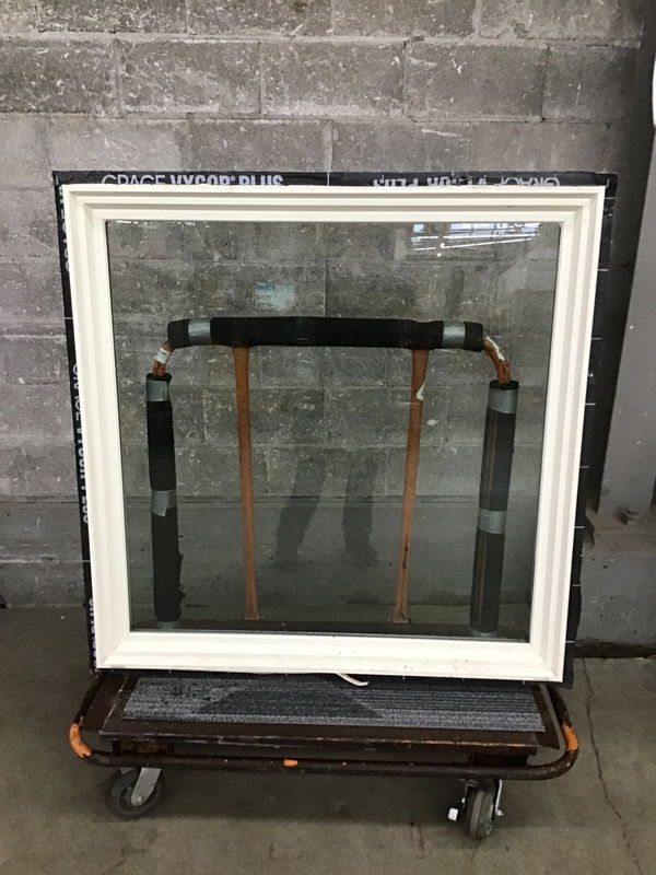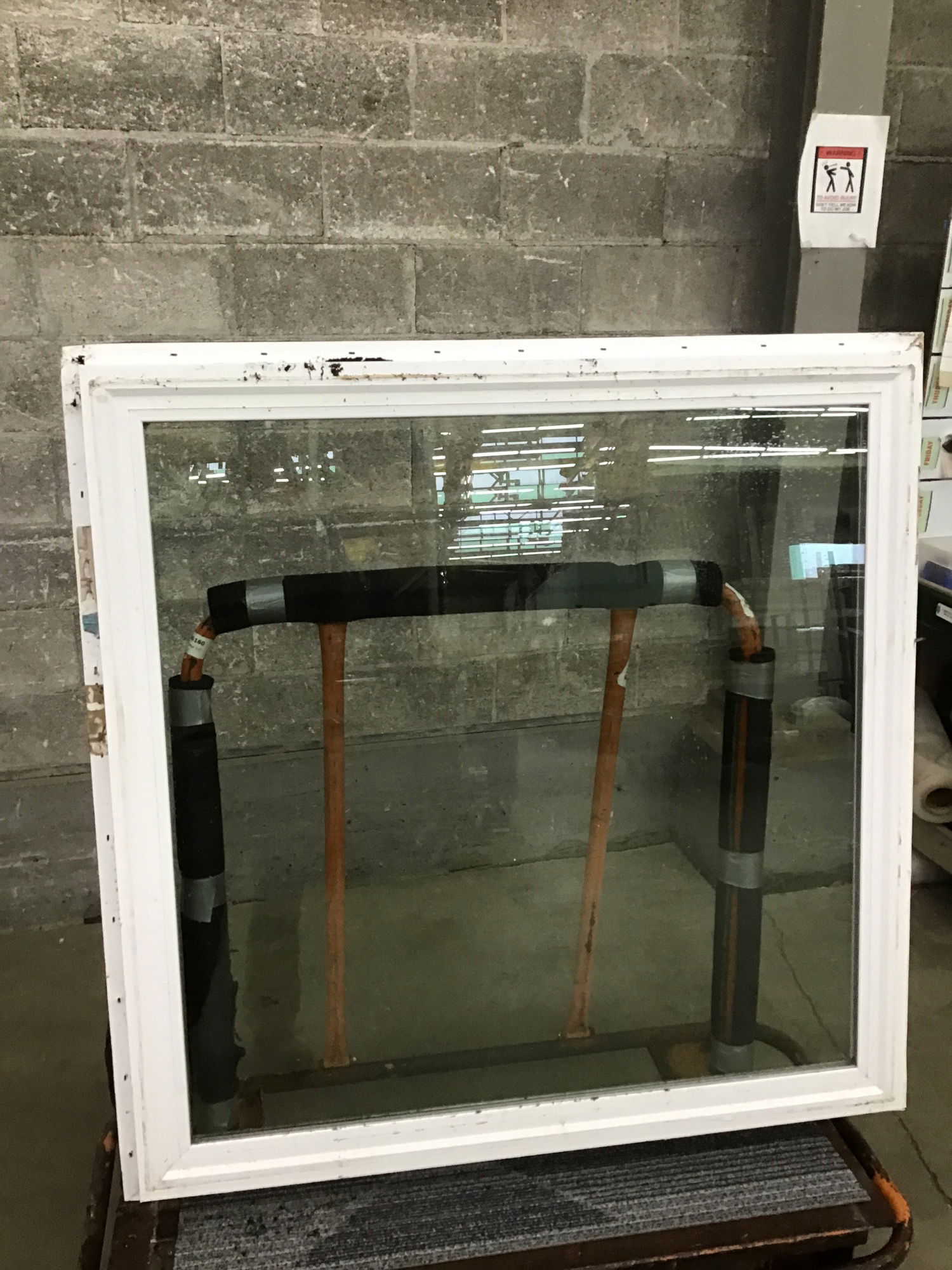 A white and beige vinyl fixed window, with nailing fins, thermopane glass and looks to have been made in 2016. This would make a good living room window.