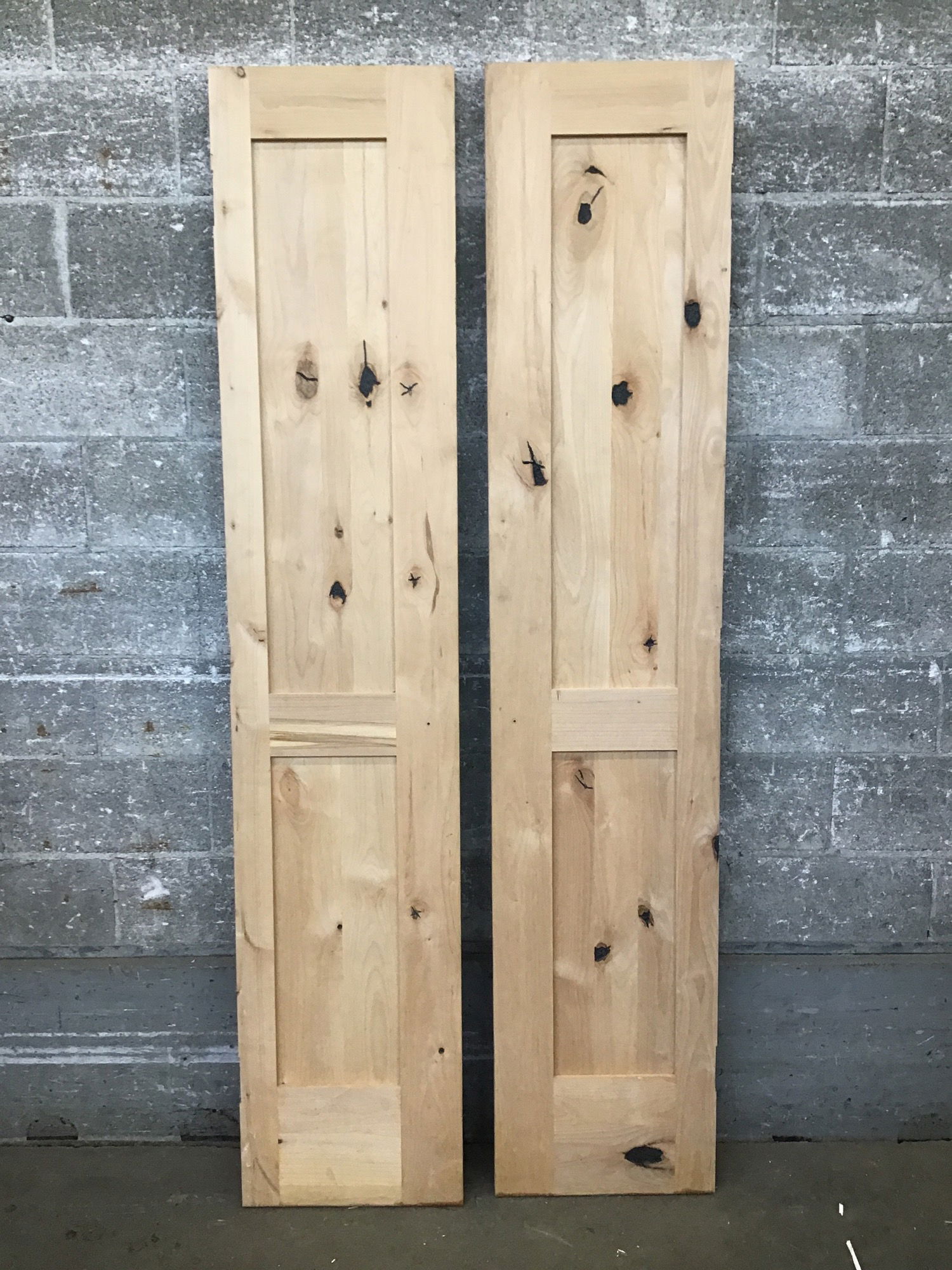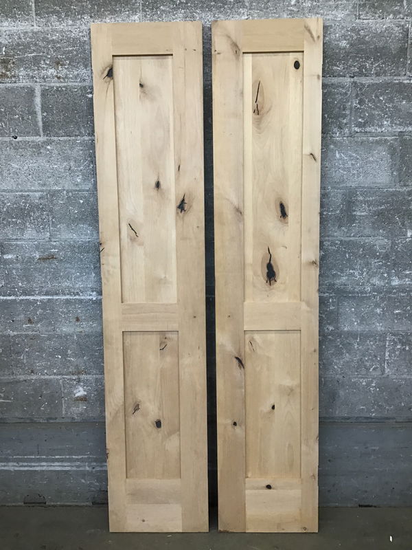 Pair of nice hinged closet or bypass doors with raw wood finish. Both doors are open swing.