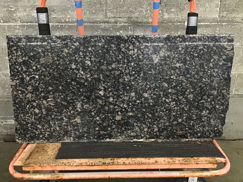 Granite countertop with finished front edge. Length listed is from straight right unfinished edge to start of break (largest rectangle that could be cut from piece). There are some small chips along the finished front edge. Price reflects.