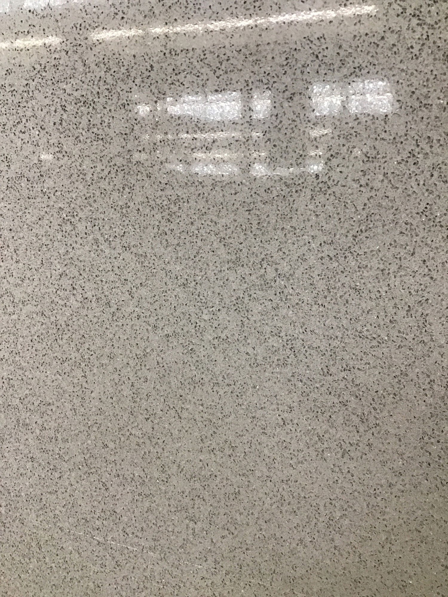 Slab of handsome grey composite stone countertop with bullnose along both long edges.