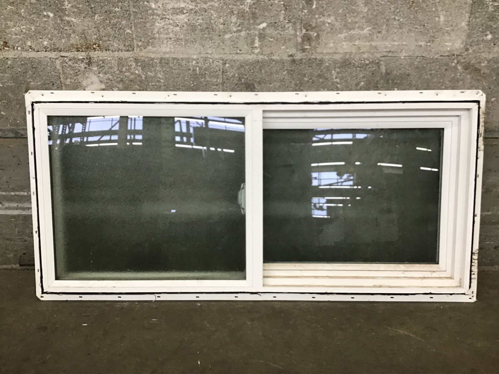 OX vinyl slider mfg in 2015, good shape overall with textured obscured glass panes.