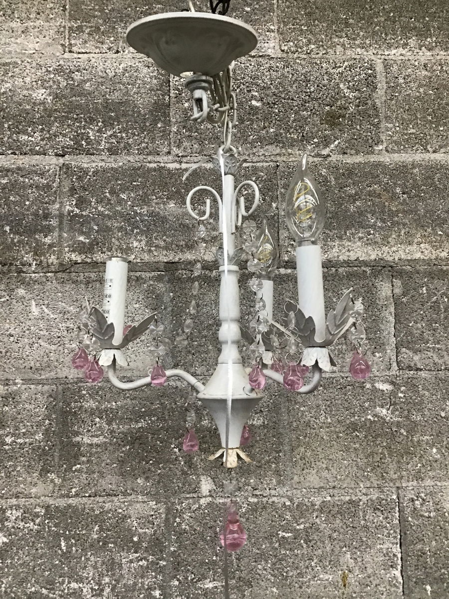 A cute li'l chandelier with some dangling faux crystals that hang from each of its three candlestick-style bulbs, all with a white paint job over the finish.