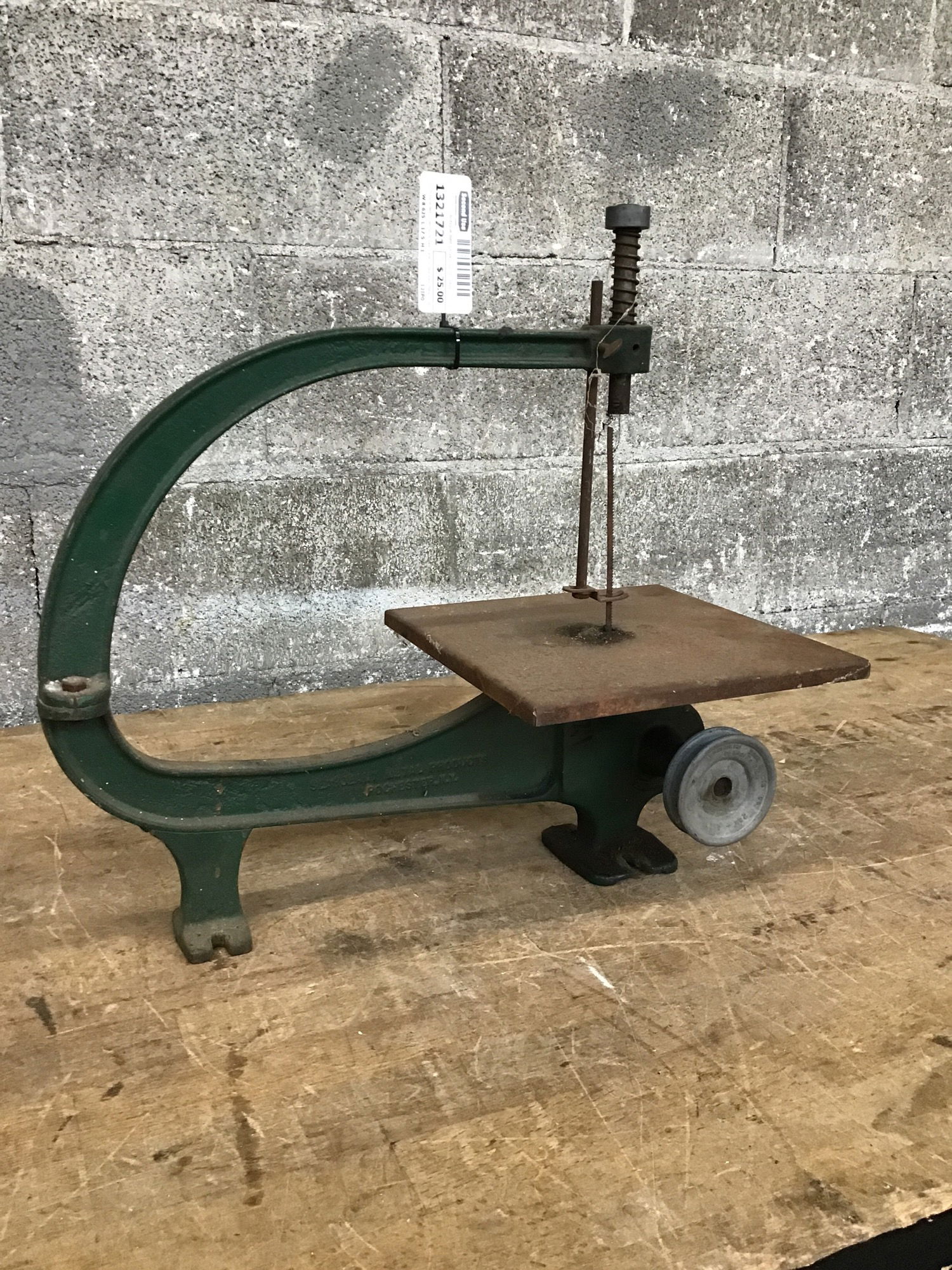 Antique Belt Driven Scroll Saw made by Searjeant Metal Products. Does not come with a motor or belt.