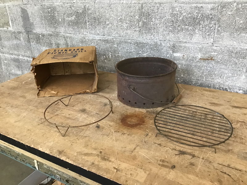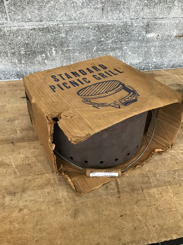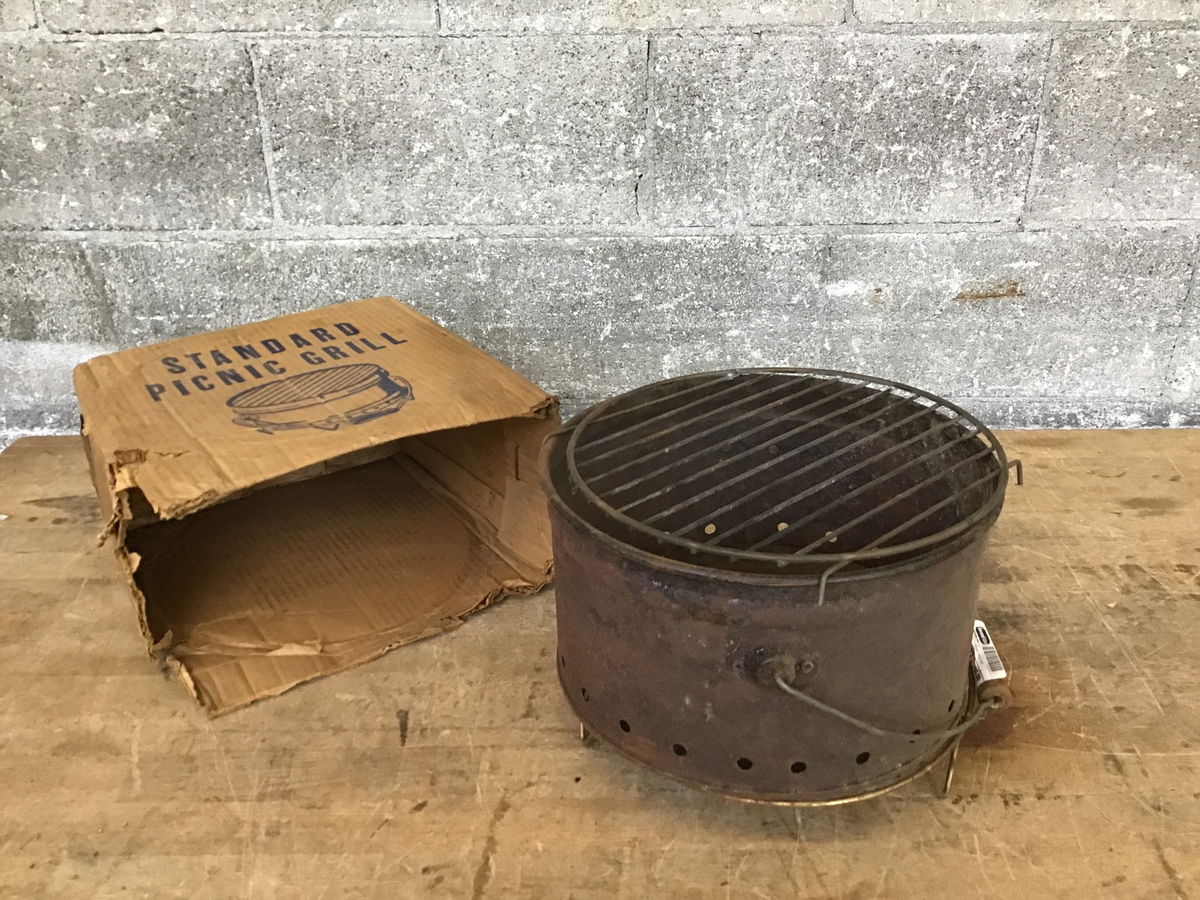 Vintage Picnic Grill that has definitely seen some use, but it comes in its original box!