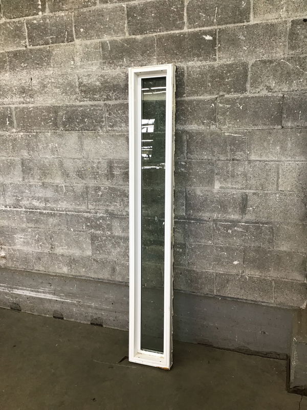 Ca. 2015 White vinyl framed fixed window that's just the right size to be a side lite. Item may have cosmetic damage and some caulking to remove from the edges. Photo may be representational.