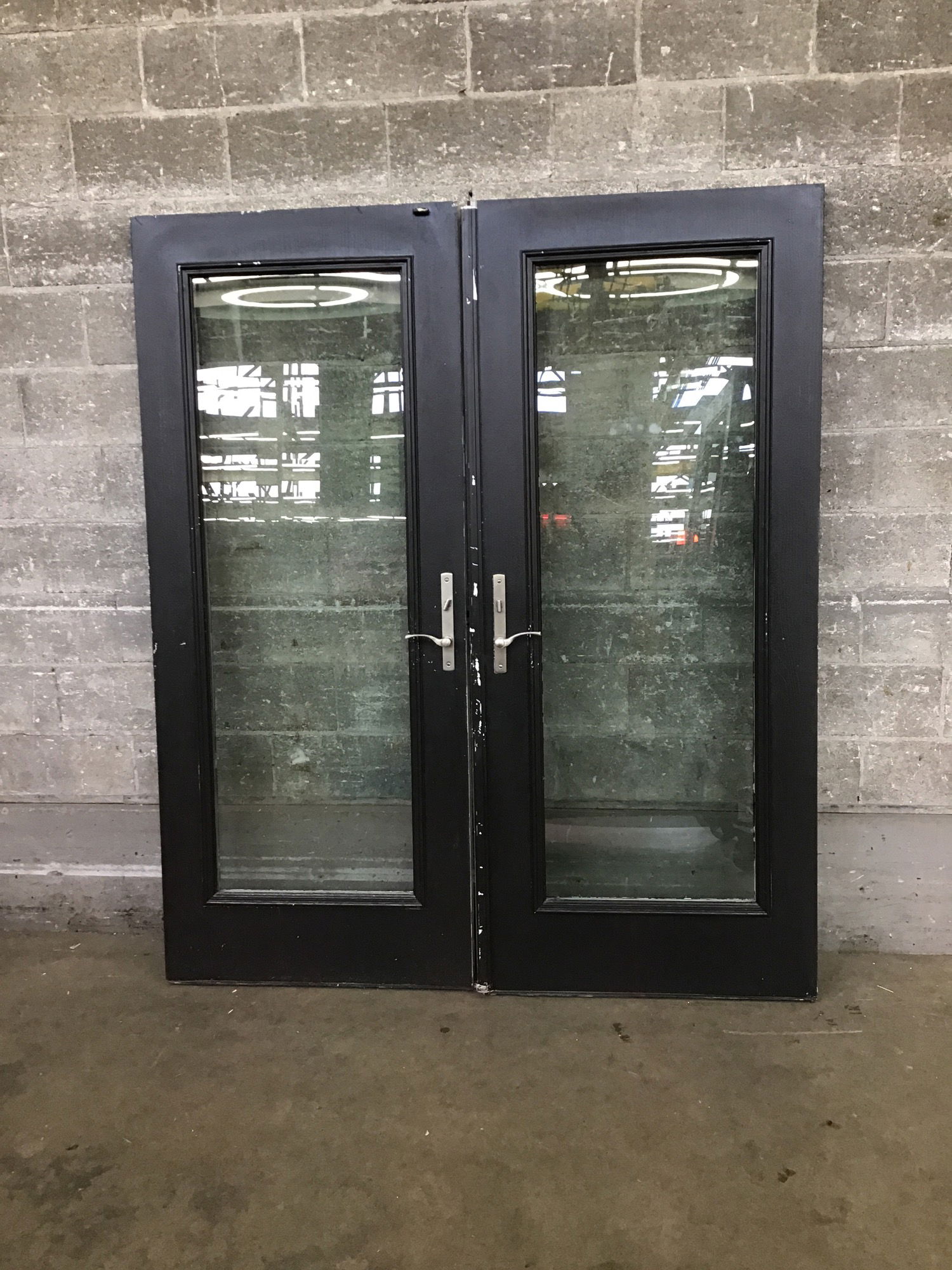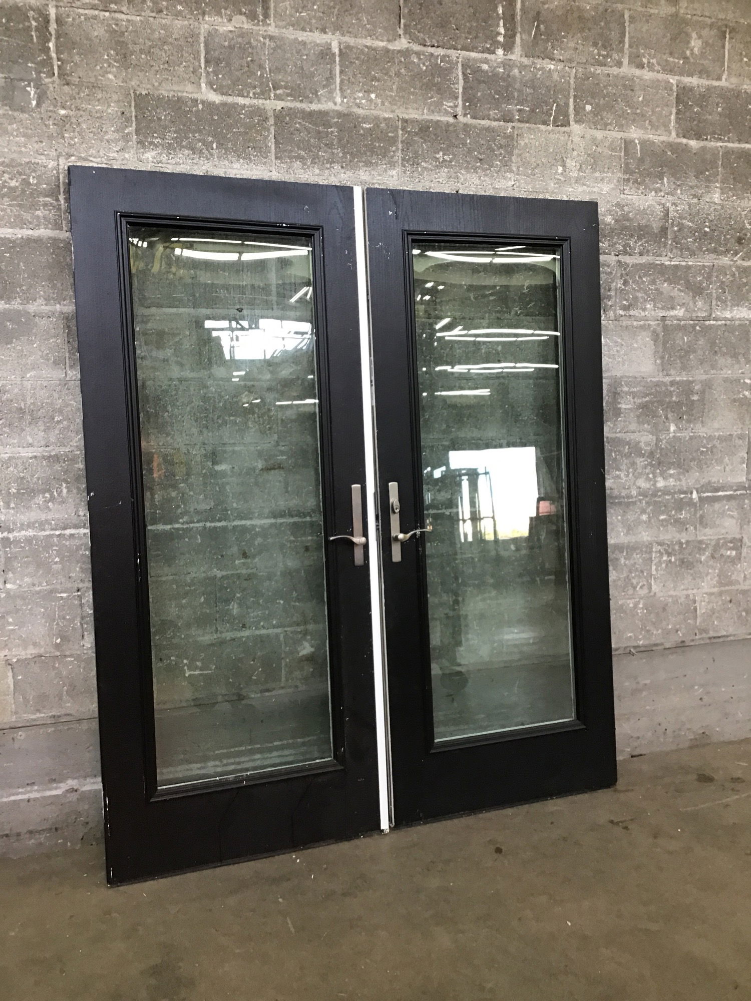 Pair of 32 3/4" wide (plus the 3/4" thick astragal on the inactive door) pair of faux wood grain fiberglass full lite doors that were set up for an outswing application. We left the three point latch mechanism in the door, since it looks pretty specific. Could use a fresh coat of paint. Photo may be representational.