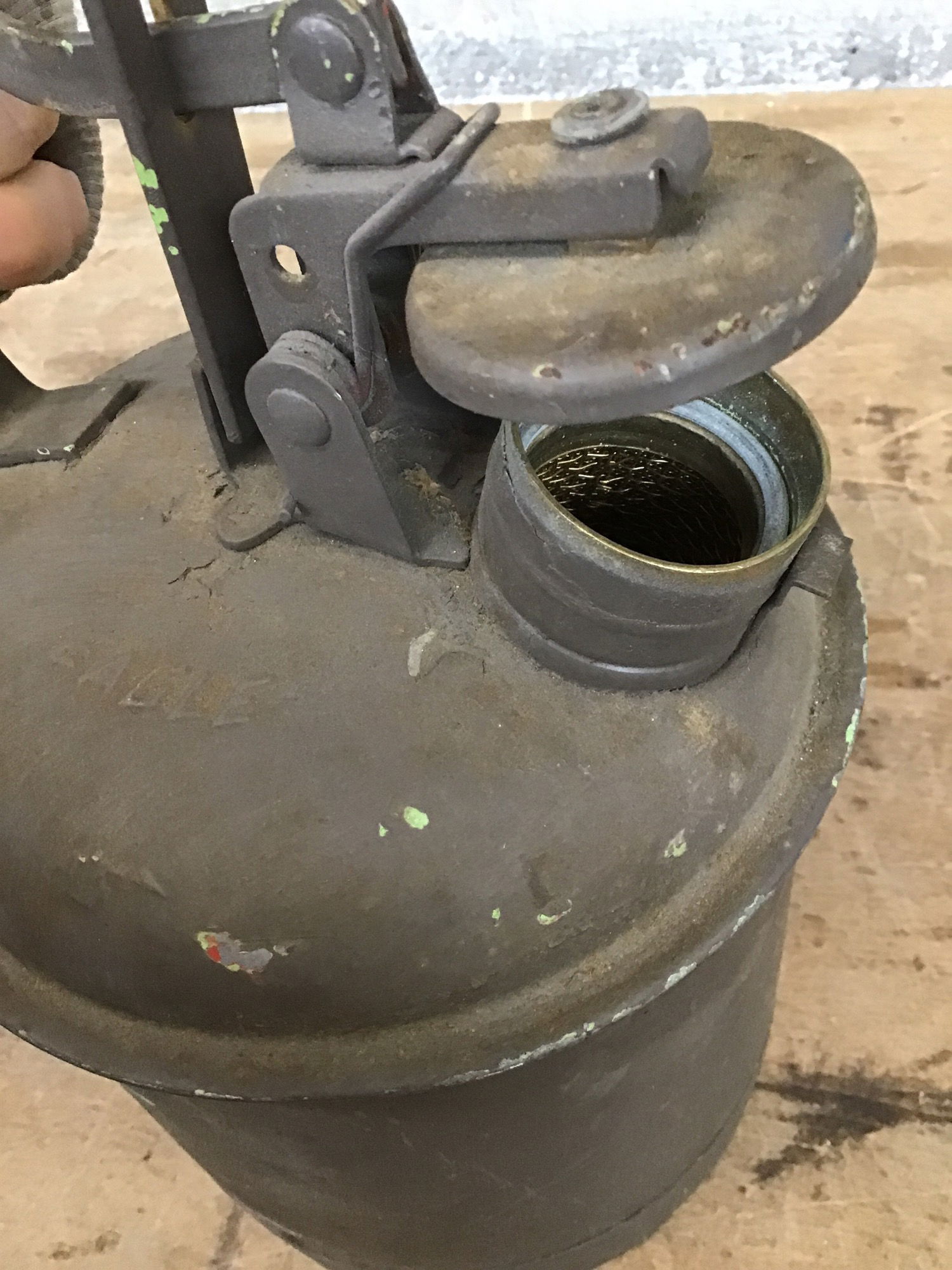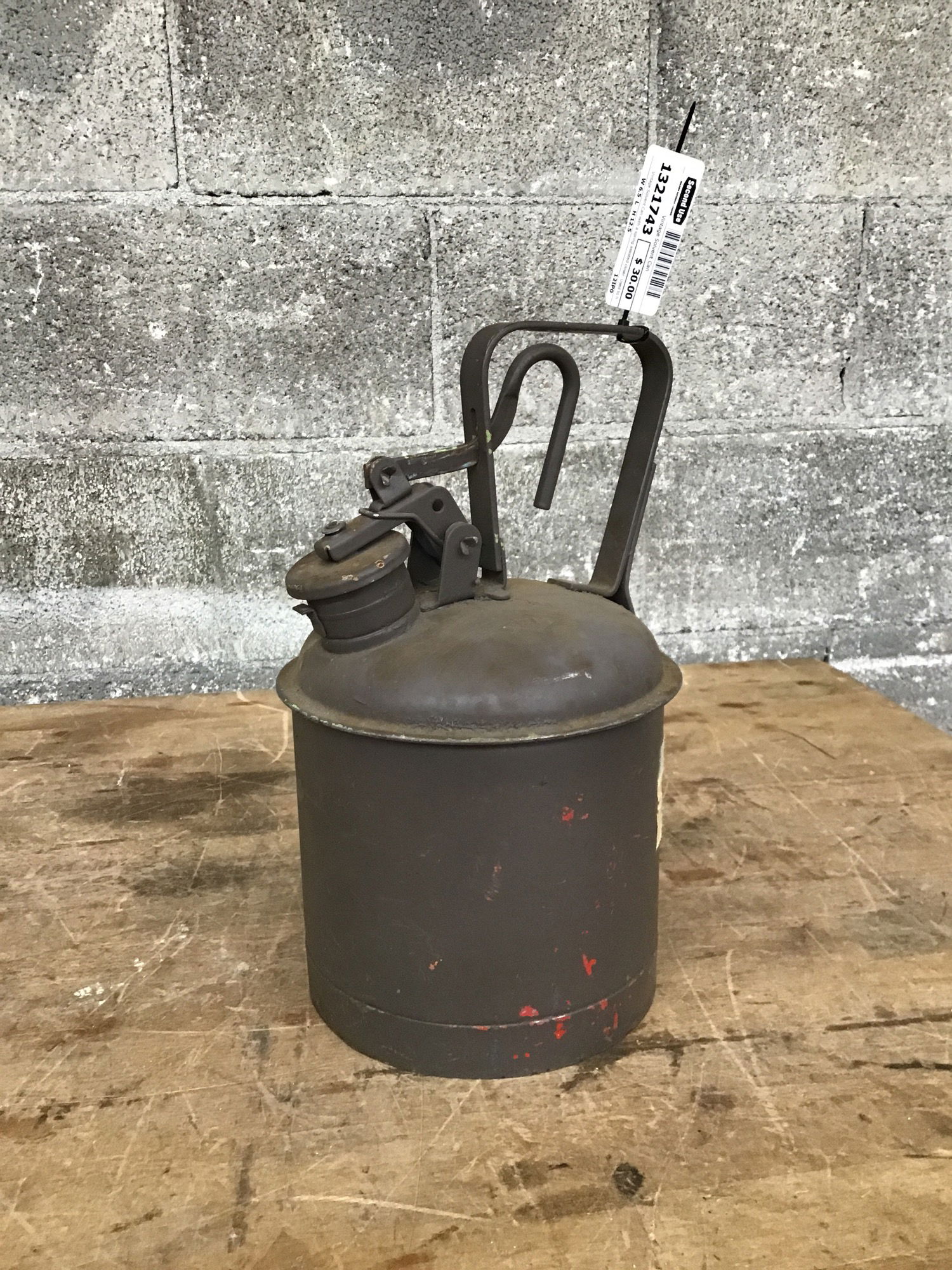 Vintage Solvent Can with a spring assisted closer. Used to hold solvent, but after some cleaning you could put whatever you want in there.