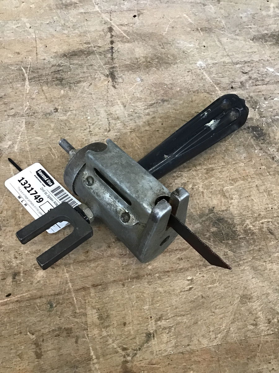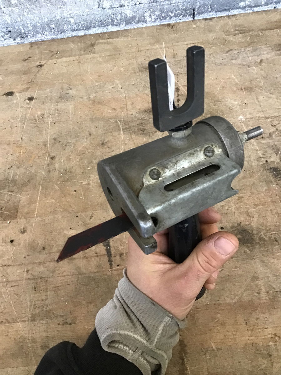 This is a vintage portable drill-to-jigsaw adapter that as far as I can tell works just fine.