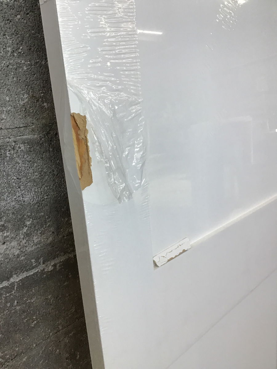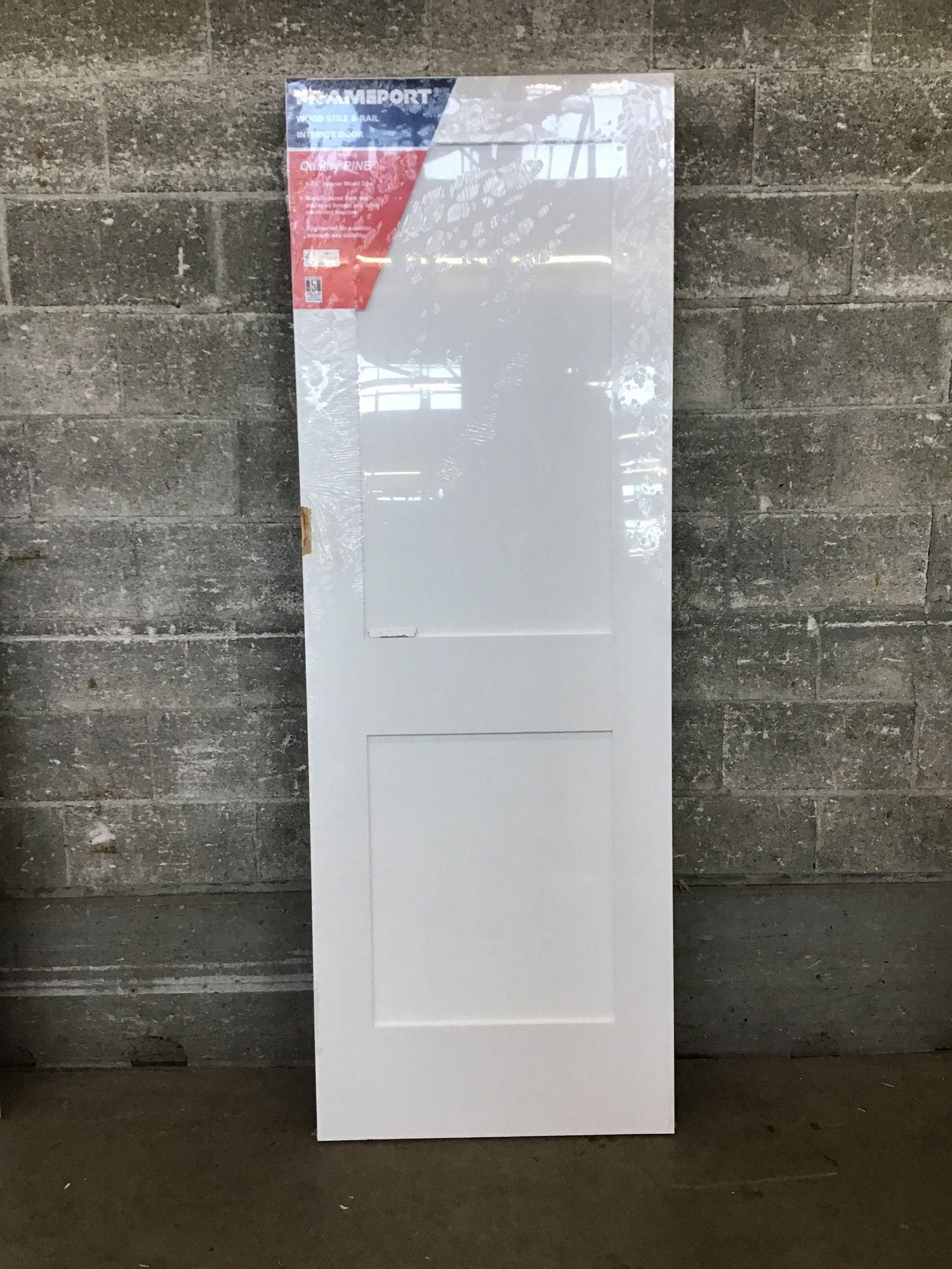Never installed, uncut, primed masonite, Shaker style two panel door with some cosmetic damage on one side. Still has plastic wrap on it! Turn this into a bypass closet door and you'll never even see the damage.