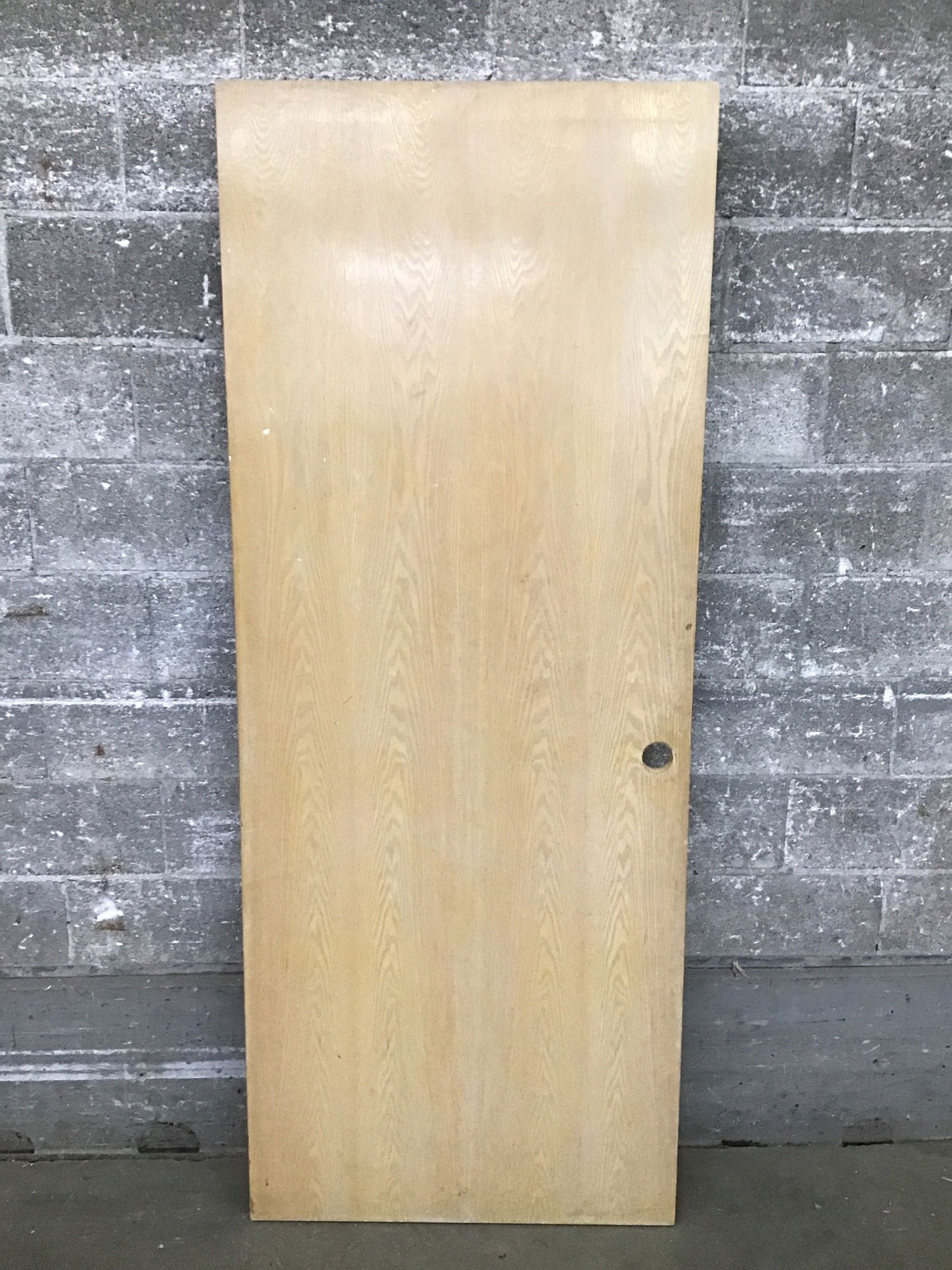 A wood hollow core interior left hand swing door. Has a soft and sandy beige stain. This door would make a decent bedroom door.