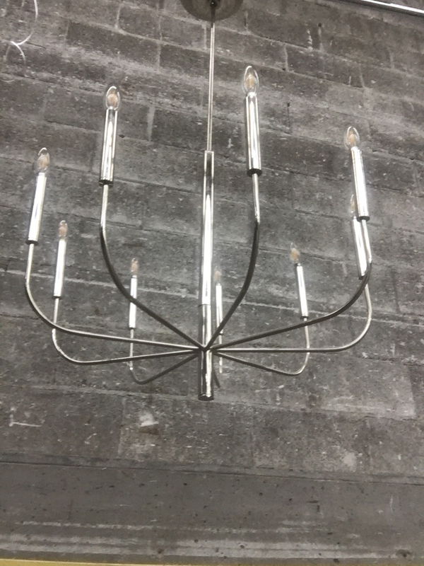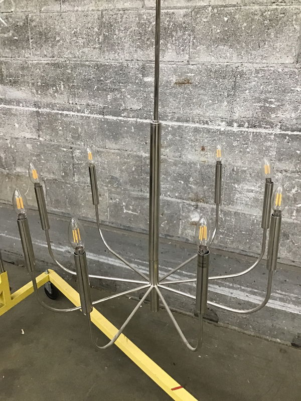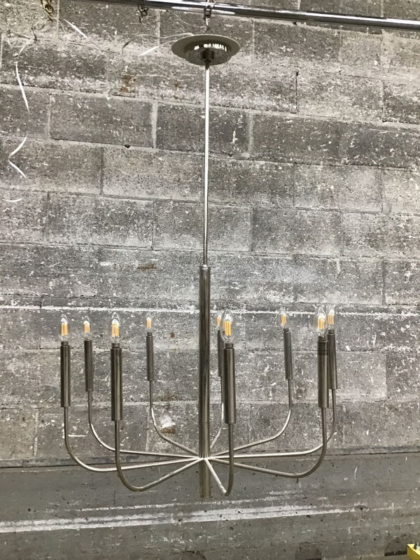 Ca. 2020 Visual Comfort "Brianna" nine arm chandelier that's got a polished nickel finish and suitable for damp locations. Still available at Ferguson, HD, or numerous other online retailers for $999. Dimensions are approximate.