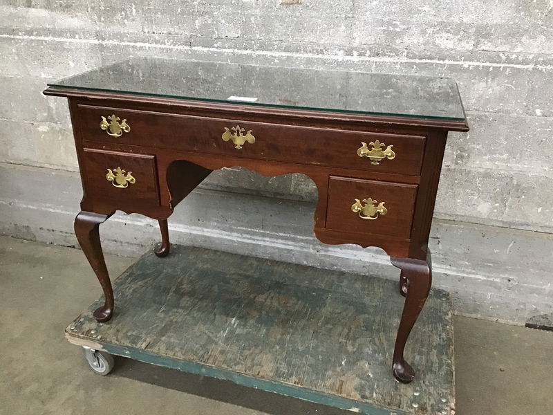This is a dashing narrow hallway table in a classic Chippendale style, which features mahogany construction, elaborate pulls, and elegantly style legs and feet. Has a glass top.