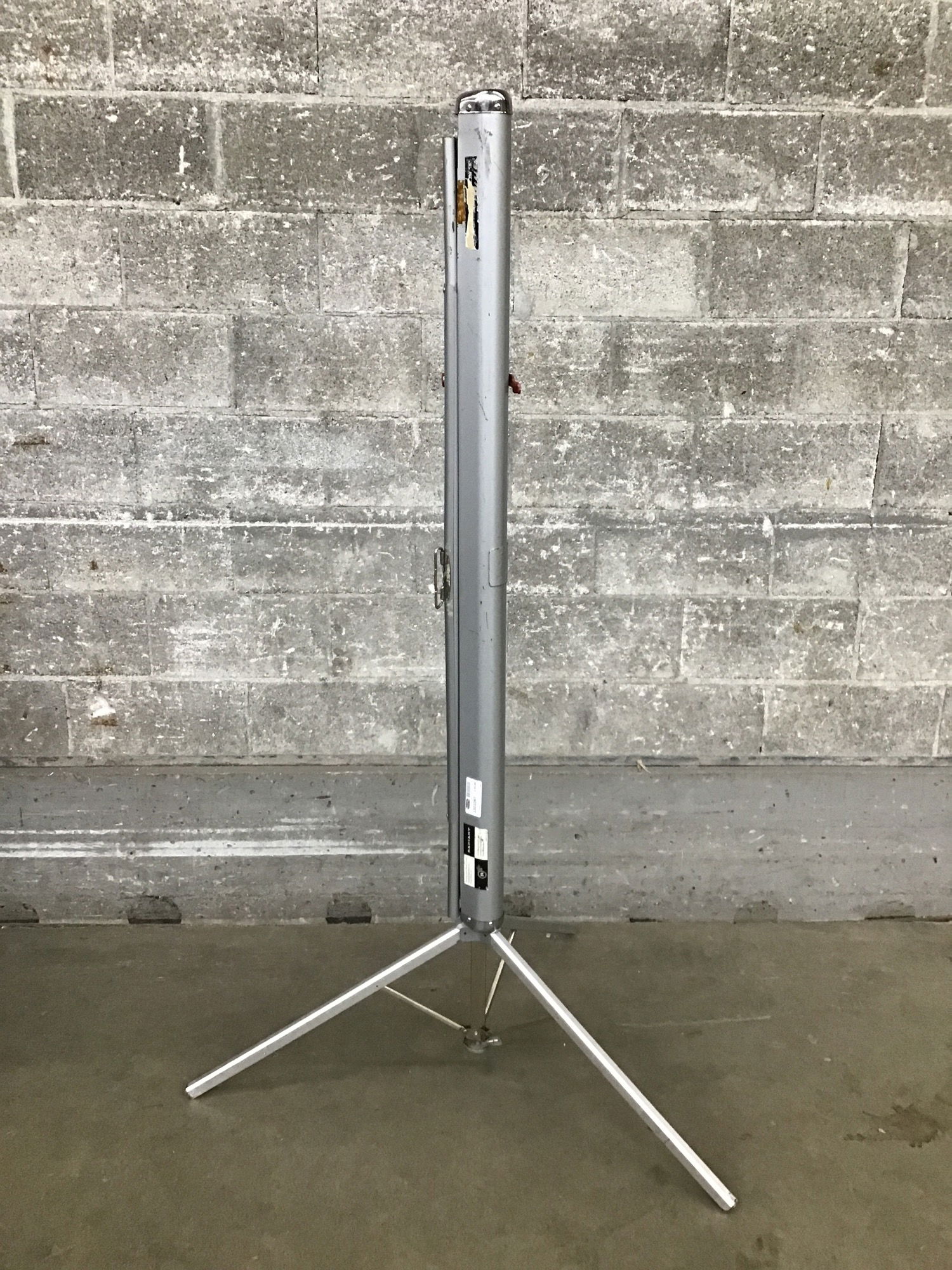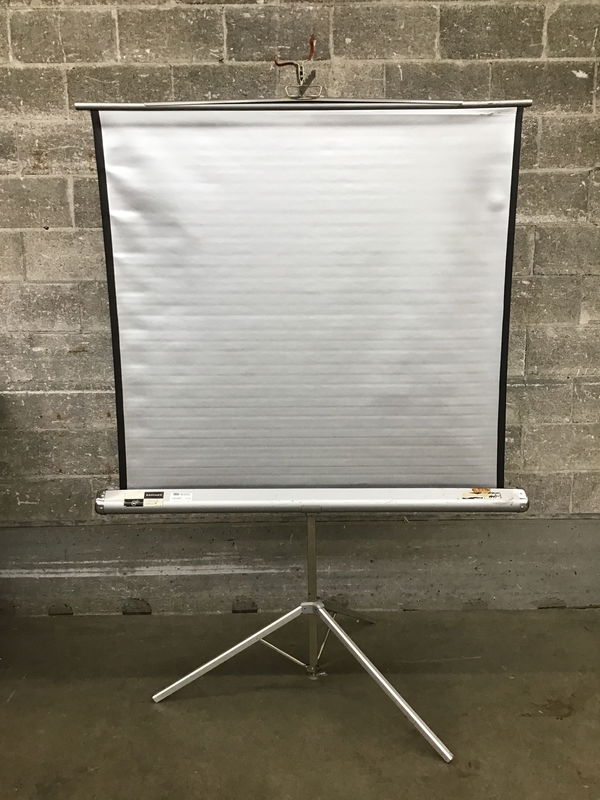 Vintage Radiant brand portable projector screen. Stand collapses and expands well, screen is about 4x4'. Fun midcentury look to it all!