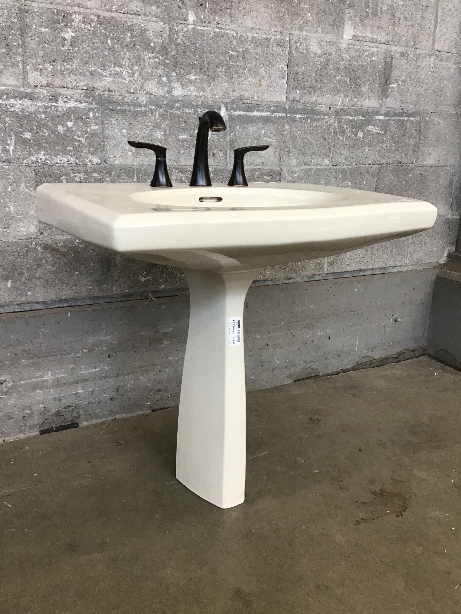 Modern American Standard pedestal sink in a biscuit-y off white glaze. Comes with a Pfister brand faucet in an oil rubbed bronze finish.