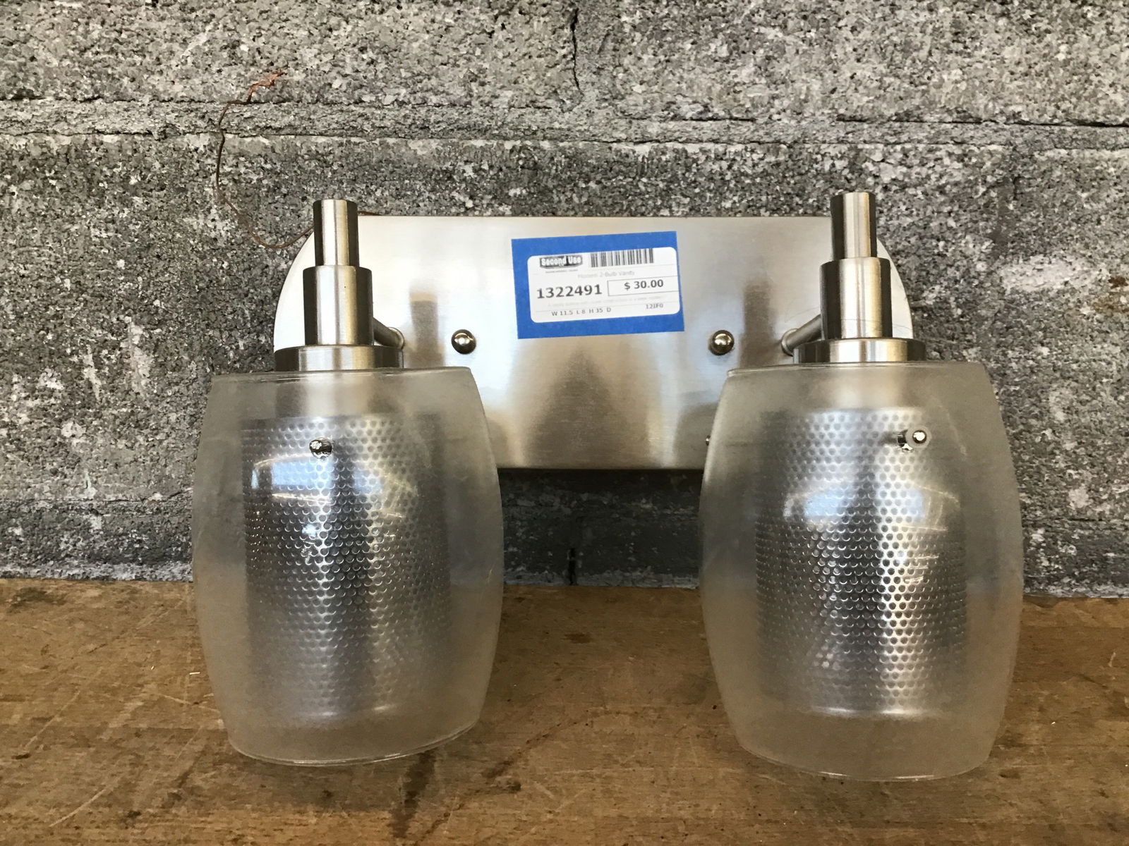 A vanity sconce with nickel construction in a sleek modern finish, with both bulbs being covered by two fitters each- an interior one made of perforated metal and the outer glass.