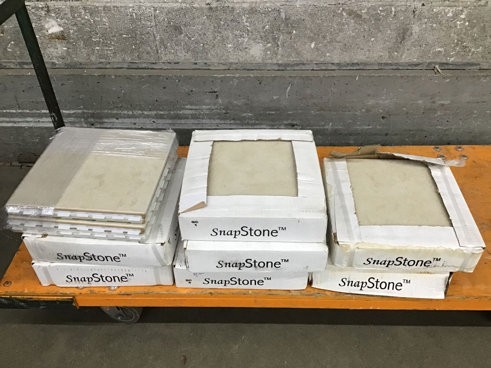Unused box of Snap Stone ceramic floor tile with an engineered plastic backing/flange that aids quick installation. Bulk item, first come, first served.