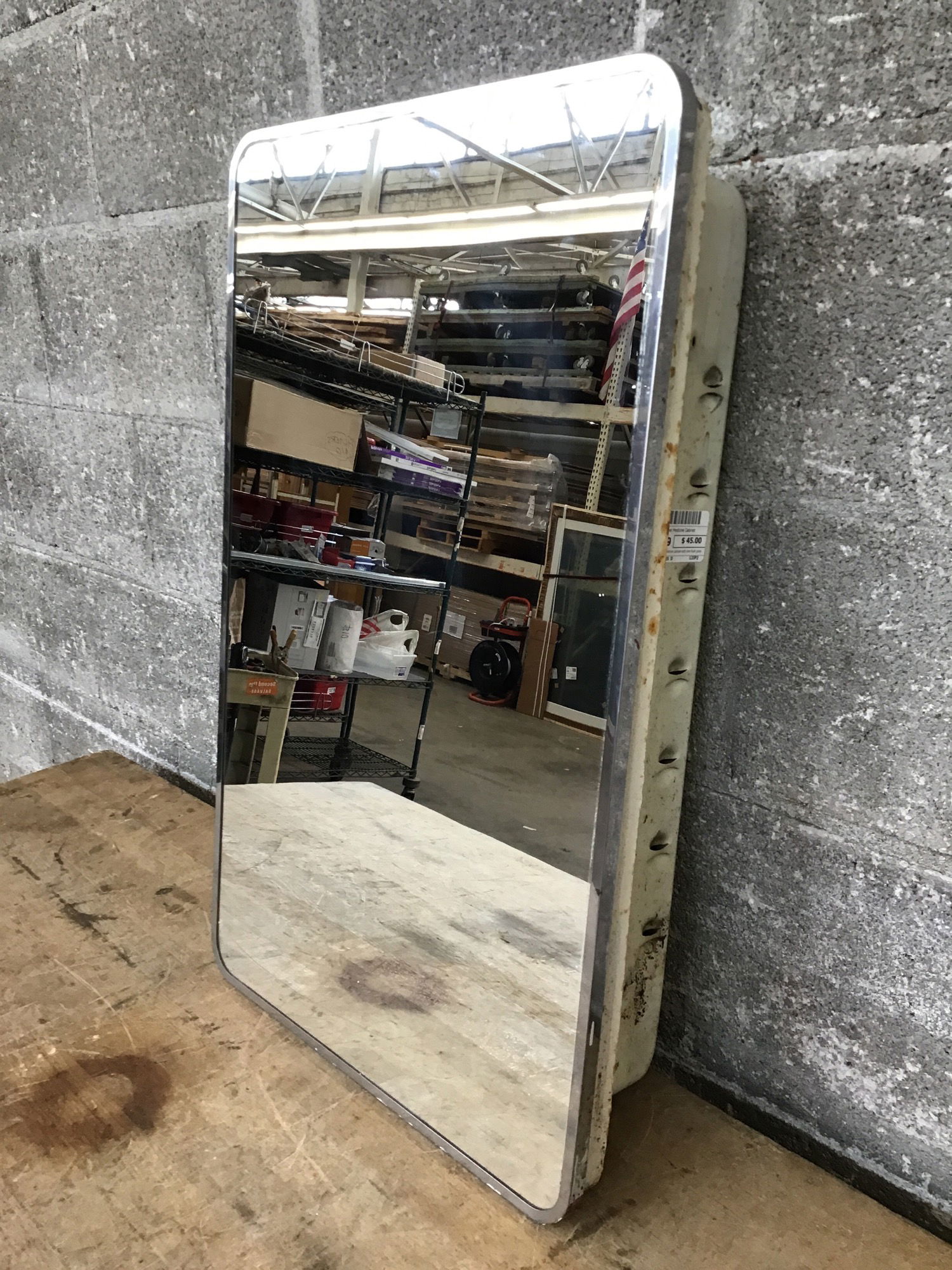 This is a vintage steel medicine cabinet with one flush pane of mirror. Does not come with glass shelves.
