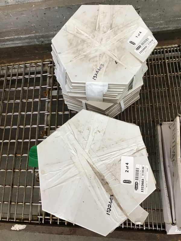 4 cases of white ceramic hexagonal tiles measuring 13" across. 55 tiles total, about 40sqft. Similar product sells for about $9/sqft at Home Depot.