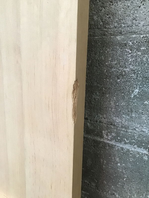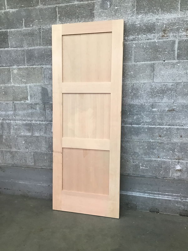 Like new, never installed 3 shaker panel door with no finish, no hinge cuts, no knob holes. Has two points of damage on the edge of one stile. Price reflects.