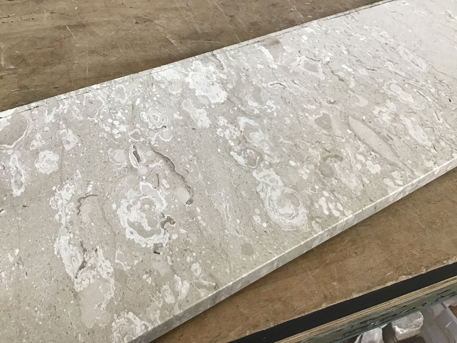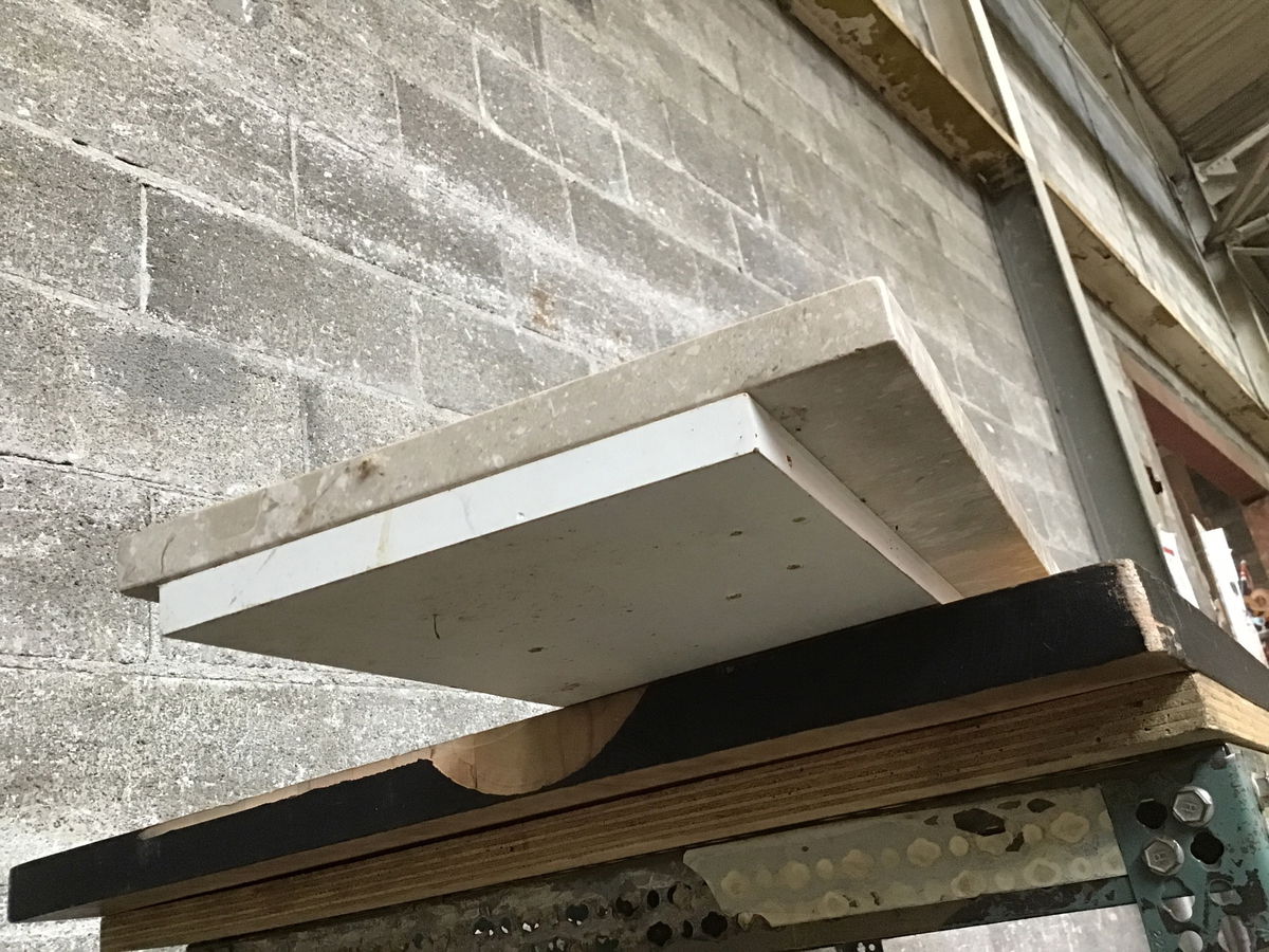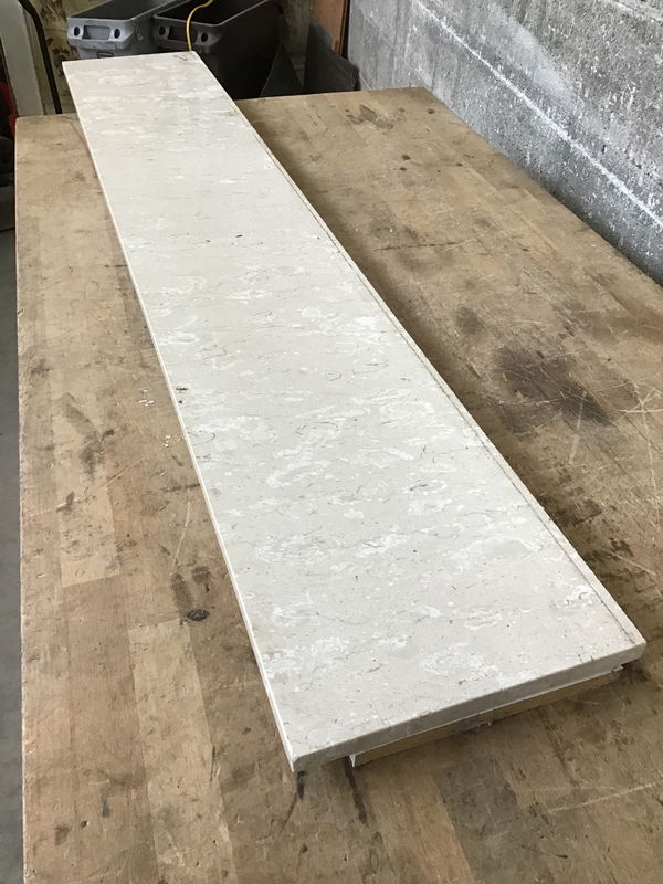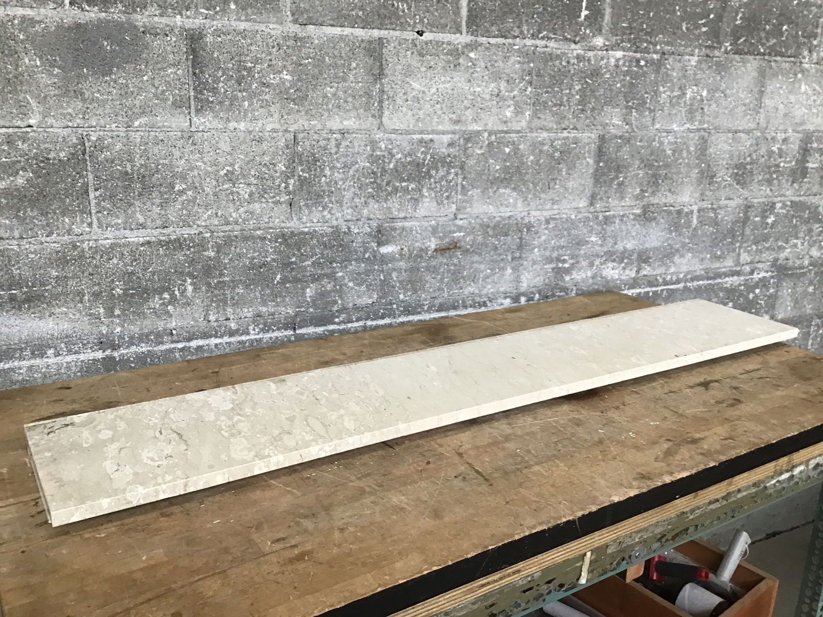 Narrow limestone countertop that's attached to a backer board for added rigidity. I think it was used as a bar top or floating shelf previously. Ready to repurpose! Photo may be representational.  Finished along three sides.