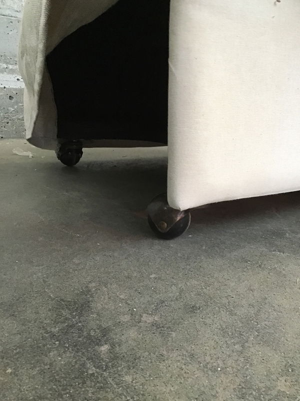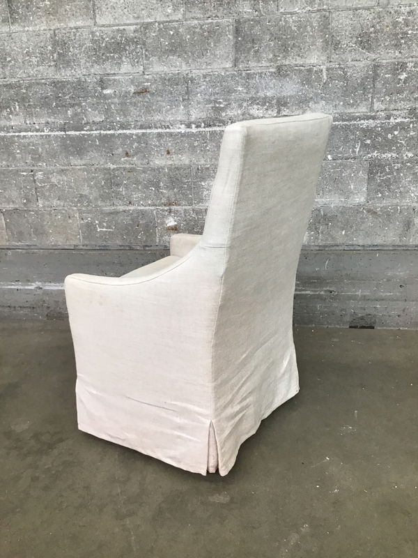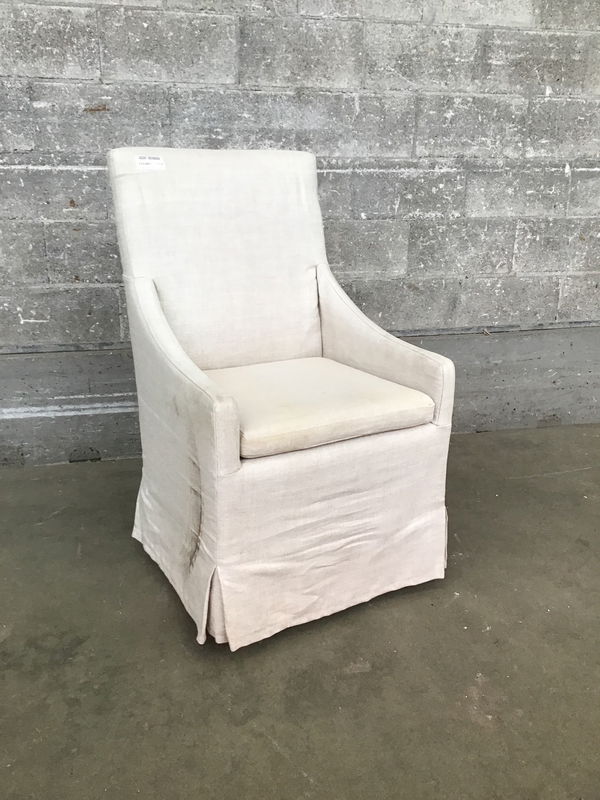 From the esteemed Restoration Hardware we have an Ellison slope-arm skirted dining arm chair with a taller back. The chair is on casters for ease of movement, made in 2015 and looks to have removable/washable slip covers. This seems to retail new at $995.